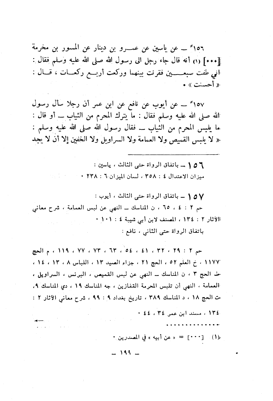 ١٥٧ - عَنْ أَيُّوبَ، عَنْ نَافِعٍ، عَنِ ابْنِ عُمَرَ، أَنَّ رَجُلًا، سَأَلَ رَسُولَ اللَّهِ صَلَّى اللهُ عَلَيْهِ وَسَلَّمَ فَقَالَ: مَا يَتْرُكُ الْمُحْرِمُ مِنَ الثِّيَابِ؟ أَوْ قَالَ: مَا يَلْبَسُ الْمُحْرِمُ مِنَ الثِّيَابِ؟ فَقَالَ رَسُولُ اللَّهِ صَلَّى اللهُ عَلَيْهِ وَسَلَّمَ: «لَا يَلْبَسُ الْقَمِيصَ، وَلَا الْعِمَامَةَ، وَلَا السَّرَاوِيلَ، وَلَا الْخُفَّيْنِ، إِلَّا أَنْ لَا يَجِدَ ⦗٢٠٠⦘ نَعْلَيْنِ، فَإِنْ لَمْ يَجِدْ نَعْلَيْنِ فَلْيَلْبِسَ الْخُفَّيْنِ أَسْفَلَ مِنَ الْكَعْبَيْنِ، وَلَا يَلْبَسُ ثَوْبًا مَسَّهُ الْوَرْسُ وَالزَّعْفَرَانُ، وَلَا يَلْبَسُ الْبُرْنُسُ»
