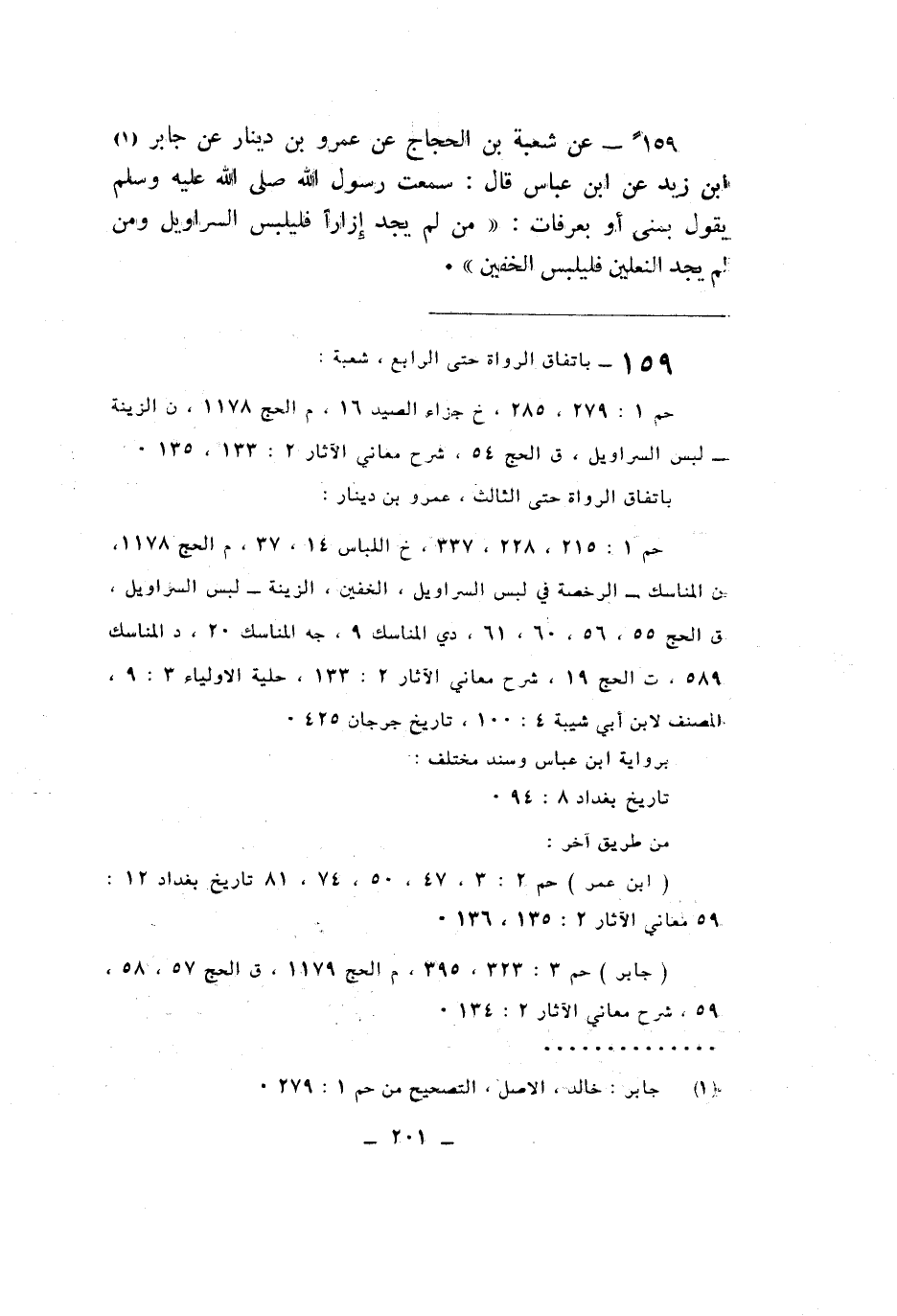 ١٥٩ - عَنْ شُعْبَةَ بْنِ الْحَجَّاجِ، عَنْ عَمْرِو بْنِ دِينَارٍ، عَنْ جَابِرِ بْنِ زَيْدٍ، عَنِ ابْنِ عَبَّاسٍ، قَالَ: سَمِعْتُ رَسُولَ اللَّهِ صَلَّى اللهُ عَلَيْهِ وَسَلَّمَ يَقُولُ بِمِنًى أَوْ بِعَرَفَاتٍ: «مَنْ لَمْ يَجِدْ إِزَارًا فَلْيَلْبِسَ السَّرَاوِيلَ، وَمَنْ لَمْ يَجِدِ النَّعْلَيْنِ فَلْيَلْبِسَ الْخُفَّيْنِ»