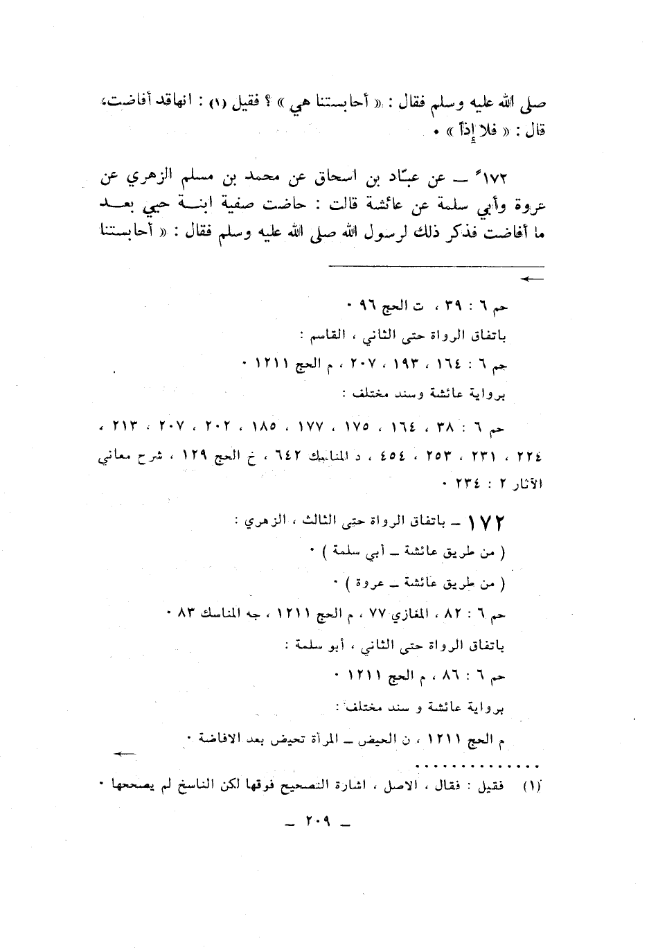 ١٧٢ - عَنْ عَبَّادِ بْنِ إِسْحَاقَ، عَنْ مُحَمَّدِ بْنِ مُسْلِمٍ الزُّهْرِيِّ، عَنْ عُرْوَةَ، وَأَبِي سَلَمَةَ، عَنْ عَائِشَةَ، قَالَتْ: حَاضَتْ صَفِيَّةُ ابْنَةُ حُيَيٍّ بَعْدَ مَا أَفَاضَتْ، فَذُكِرَ ذَلِكَ لِرَسُولِ اللَّهِ صَلَّى اللهُ عَلَيْهِ وَسَلَّمَ فَقَالَ: «أَحَابِسَتُنَا ⦗٢١٠⦘ هِيَ؟» قَالَتْ: فَقُلْتُ: يَا رَسُولَ اللَّهِ صَلَّى اللهُ عَلَيْهِ وَسَلَّمَ إِنَّهَا قَدْ أَفَاضَتْ، وَطَافَتْ بِالْبَيْتِ، ثُمَّ حَاضَتْ بَعْدَ الْإِفَاضَةِ؟ قَالَتْ: فَقَالَ رَسُولُ اللَّهِ صَلَّى اللهُ عَلَيْهِ وَسَلَّمَ: فَلْتَنْفِرْ "