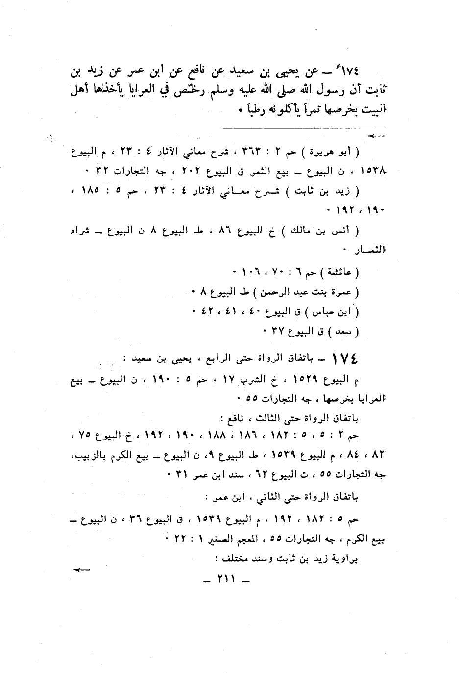 ١٧٤ - عَنْ يَحْيَى بْنِ سَعِيدٍ، عَنْ نَافِعٍ، عَنِ ابْنِ عُمَرَ، عَنْ زَيْدِ بْنِ ثَابِتٍ، أَنَّ رَسُولَ اللَّهِ صَلَّى اللهُ عَلَيْهِ وَسَلَّمَ «رَخَّصَ فِي الْعَرَايَا، يَأْخُذُهَا أَهْلُ الْبَيْتِ بِخَرْصِهَا تَمْرًا، يَأْكُلُونَهُ رُطَبًا»