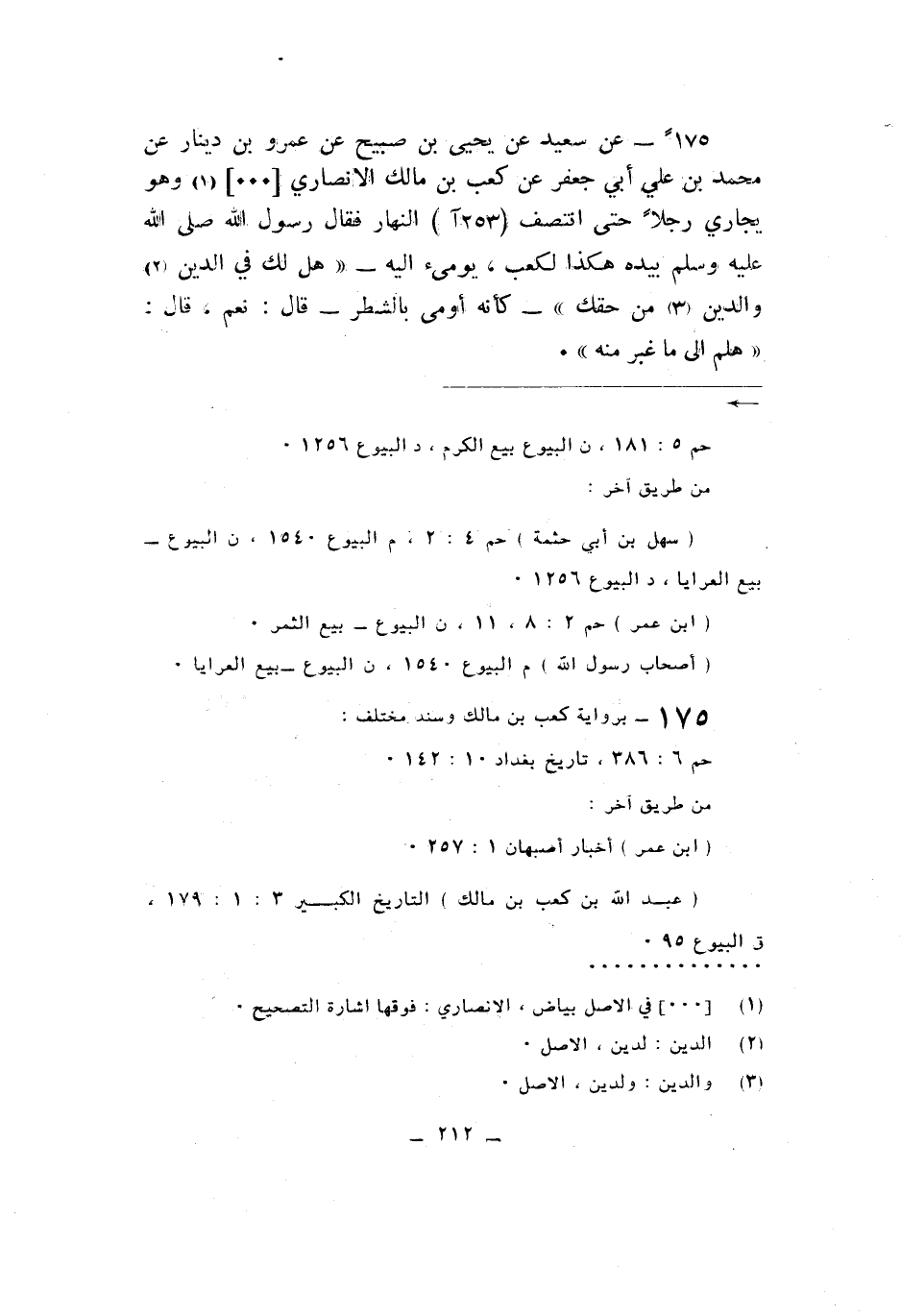 ١٧٥ - عَنْ سَعِيدٍ، عَنْ يَحْيَى بْنِ صُبَيْحٍ، عَنْ عَمْرِو بْنِ دِينَارٍ، عَنْ مُحَمَّدِ بْنِ عَلِيٍّ أَبِي جَعْفَرٍ، عَنْ كَعْبِ بْنِ مَالِكٍ الْأَنْصَارِيِّ،. .. وَهُوَ يُجَارِي رَجُلًا حَتَّى انْتَصَفَ النَّهَارُ فَقَالَ رَسُولُ اللَّهِ صَلَّى اللهُ عَلَيْهِ وَسَلَّمَ بِيَدِهِ هَكَذَا لْكَعْبٍ يُومِئُ إِلَيْهِ: «هَلْ لَكَ فِي الدِّينِ وَالدَّيْنِ مِنْ حَقِّكَ؟» كَأَنَّهُ أَوْمَى بِالشَّطْرِ قَالَ: نَعَمْ. قَالَ: «هَلُمَّ إِلَى مَا غَبَرَ مِنْهُ»