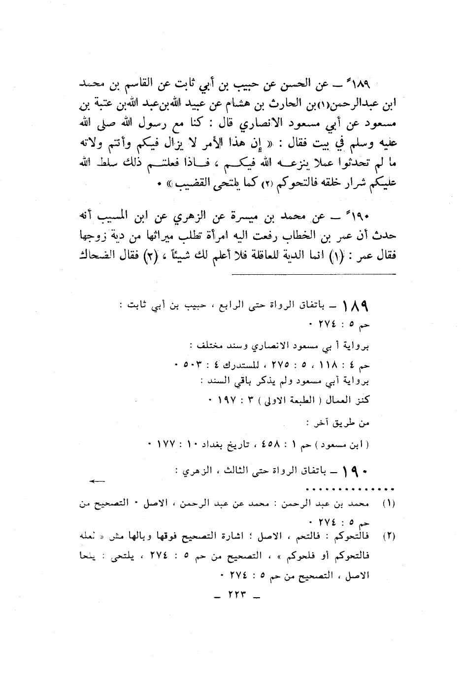 ١٩٠ - عَنْ مُحَمَّدِ بْنِ مَيْسَرَةَ، عَنِ الزُّهْرِيِّ، عَنِ ابْنِ الْمُسَيِّبِ، أَنَّهُ حَدَّثَ أَنَّ عُمَرَ بْنَ الْخَطَّابِ رُفِعَتْ إِلَيْهِ امْرَأَةٌ تَطْلُبُ مِيرَاثَهَا مِنْ دِيَةِ زَوْجِهَا، فَقَالَ عُمَرُ: إِنَّمَا الدِّيَةُ لِلْعَاقِلَةِ فَلَا أَعْلَمُ لَكِ شَيْئًا. فَقَالَ الضَّحَّاكُ ⦗٢٢٤⦘ بْنُ سُفْيَانَ: أَشْهَدُ أَنَّ رَسُولَ اللَّهِ صَلَّى اللهُ عَلَيْهِ وَسَلَّمَ كَتَبَ إِلَيَّ أَنْ «أُوَرِّثَ امْرَأَةَ أَشْيَمَ الضِّبَابِيِّ مِنْ دِيَةِ زَوْجِهَا» فَوَرَّثَهَا عُمَرُ "