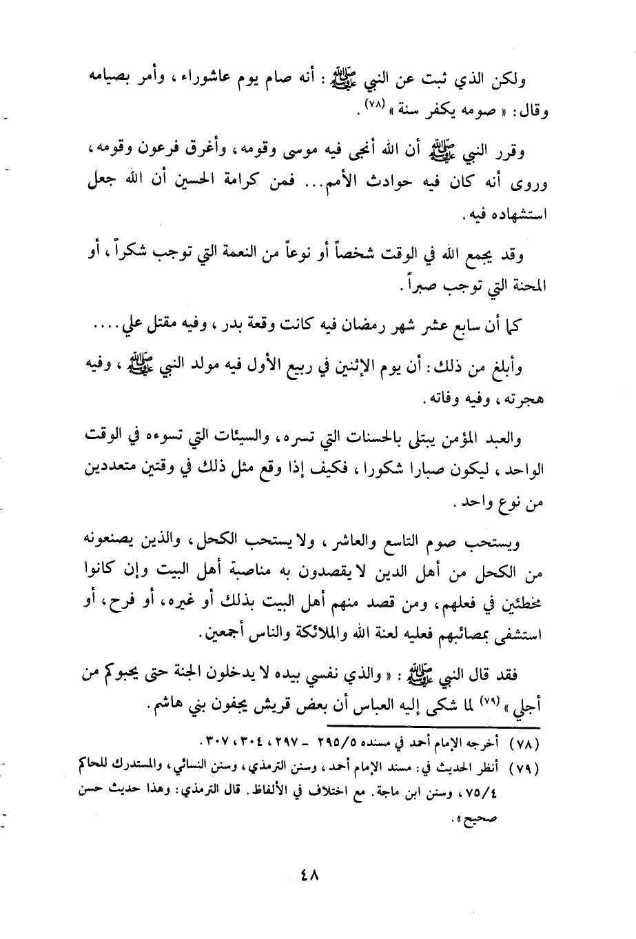 ويستحب صوم التاسع والعاشر, ولا يستحب الكحل, والذين يصنعونه من الكحل من أهل الدين لا يقصدون به مناصبة أهل البيت وإن كانوا مخطئين في فعلهم, ومن قصد منهم أهل البيت بذلك أو غيره, أو فرح, أو استشفى بمصائبهم فعليه لعنة الله والملائكة والناس أجمعين.