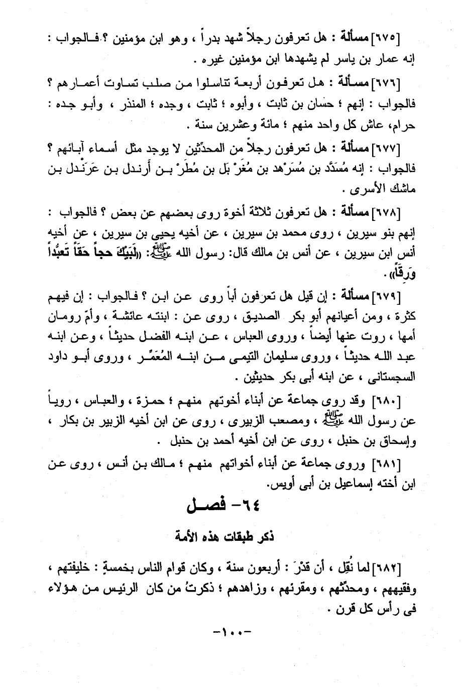 [676] مسألة: هل تعرفون أربعة تناسلوا من صلب تساوت أعمارهم؟ فالجواب: إنهم؛ حسان بن ثابت، وأبوه؛ ثابت، وجده؛ المنذر، وأبو جده: