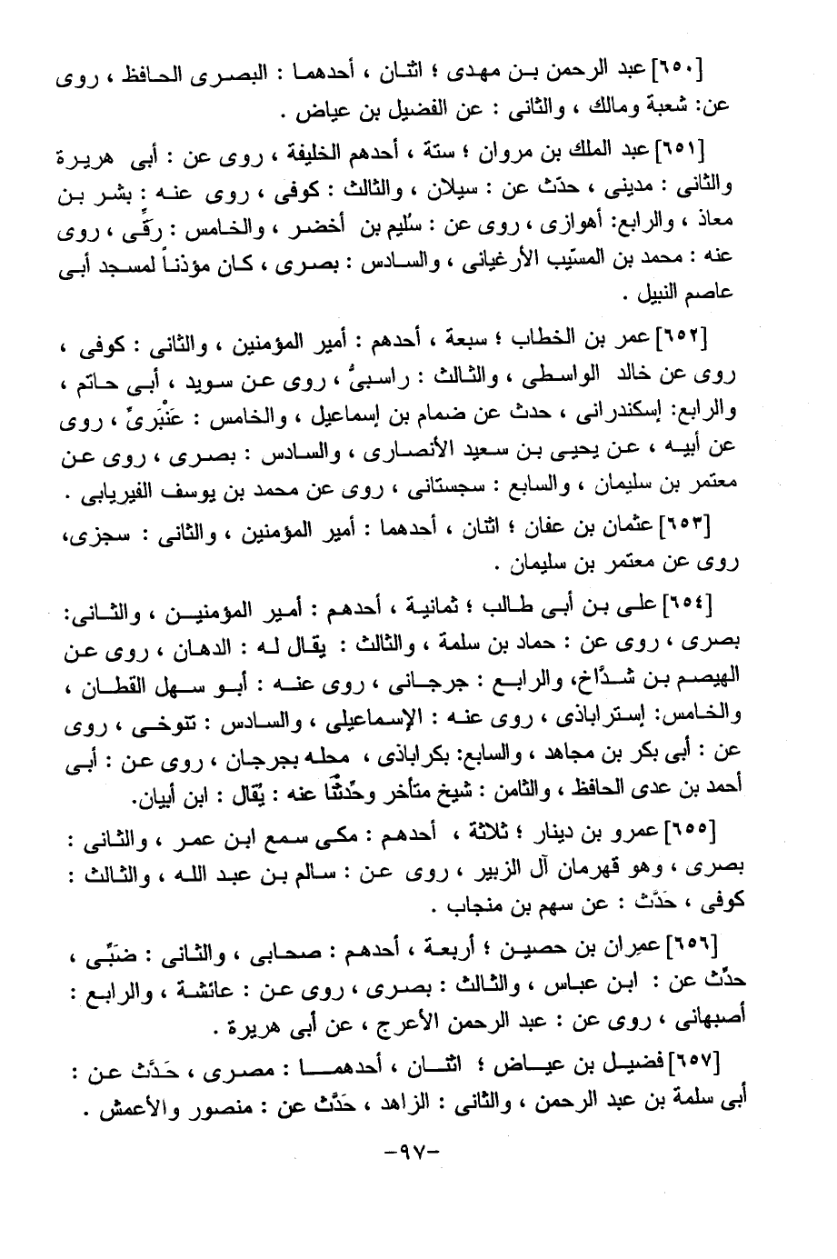 [650] عبد الرحمن بن مهدى؛ اثنان، أحدهما: البصرى الحافظ، روى عن: شعبة ومالك، والثانى: عن الفضيل بن عياض.