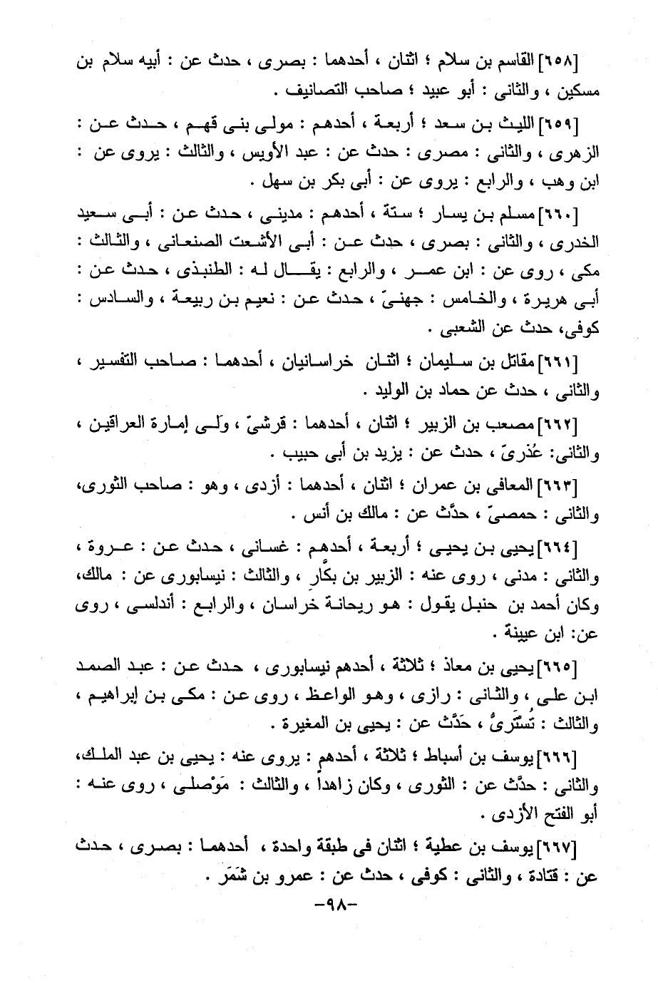 [664] يحيى بن يحيى؛ أربعة، أحدهم: غسانى، حدث عن: عروة، والثانى: مدنى، روى عنه: الزبير بن بكّار، والثالث: نيسابورى عن: مالك، وكان أحمد بن حنبل يقول: هو ريحانة خراسان، والرابع: أندلسى، روى عن: ابن عيينة.