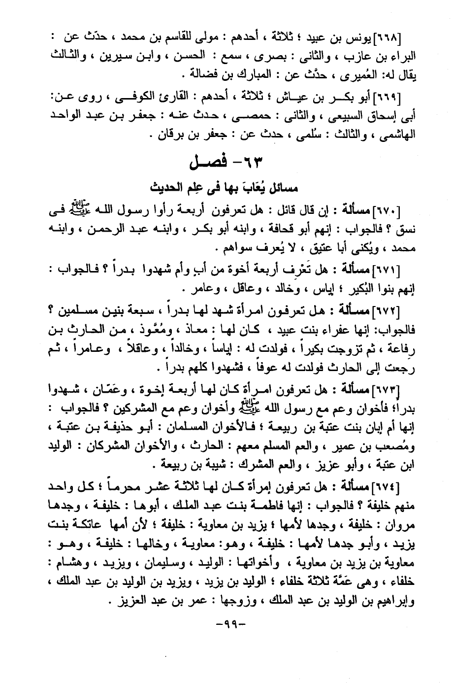 [670] مسألة: إن قال قائل: هل تعرفون أربعة رأوا رسول الله صلّى الله عليه وسلم فى نسق؟ فالجواب: إنهم أبو قحافة، وابنه أبو بكر، وابنه عبد الرحمن، وابنه محمد، ويكنى أبا عتيق، لا يعرف سواهم.