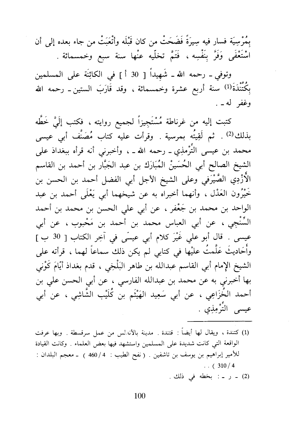 كتبت إِلَيْهِ من غرناطة مستجيزا لجَمِيع رِوَايَته فَكتب إِلَيّ خطه بذلك ثمَّ لَقيته بمرسية وقرأت عَلَيْهِ كتاب مُصَنف أبي عِيسَى مُحَمَّد بن عِيسَى التِّرْمِذِيّ رَحمَه الله وَأَخْبرنِي أَنه قَرَأَهُ ببغداذ على الشَّيْخ الصَّالح أبي الْحُسَيْن الْمُبَارك بن عبد الْجَبَّار بن أَحْمد بن الْقَاسِم الْأَزْدِيّ الصَّيْرَفِي وعَلى الشَّيْخ الْأَجَل أبي الْفضل أَحْمد بن الْحسن بن خيرون الْعدْل وأنهما أخبراه بِهِ عَن شيخهما أبي يعلى أَحْمد بن عبد الْوَاحِد بن مُحَمَّد بن جَعْفَر عَن أبي عَليّ الْحسن بن مُحَمَّد بن أَحْمد السنجي عَن أبي الْعَبَّاس مُحَمَّد بن أَحْمد بن مَحْبُوب عَن أبي عِيسَى قَالَ أَبُو عَليّ غير كَلَام أبي عِيسَى فِي آخر الْكتاب وَأَحَادِيث علمت عَلَيْهَا فِي كتابي لم يكن ذَلِك سَمَاعا لَهما قرأته على الشَّيْخ الإِمَام أبي الْقَاسِم عبد الله بن طَاهِر الْبَلْخِي قدم بغداذ أَيَّام كوني بهَا أَخْبرنِي بِهِ عَن مُحَمَّد بن عبد الله الْفَارِسِي عَن أبي الْحسن عَليّ بن أَحْمد الْخُزَاعِيّ عَن أبي سعيد الْهَيْثَم بن كُلَيْب الشَّاشِي عَن أبي عِيسَى التِّرْمِذِيّ
