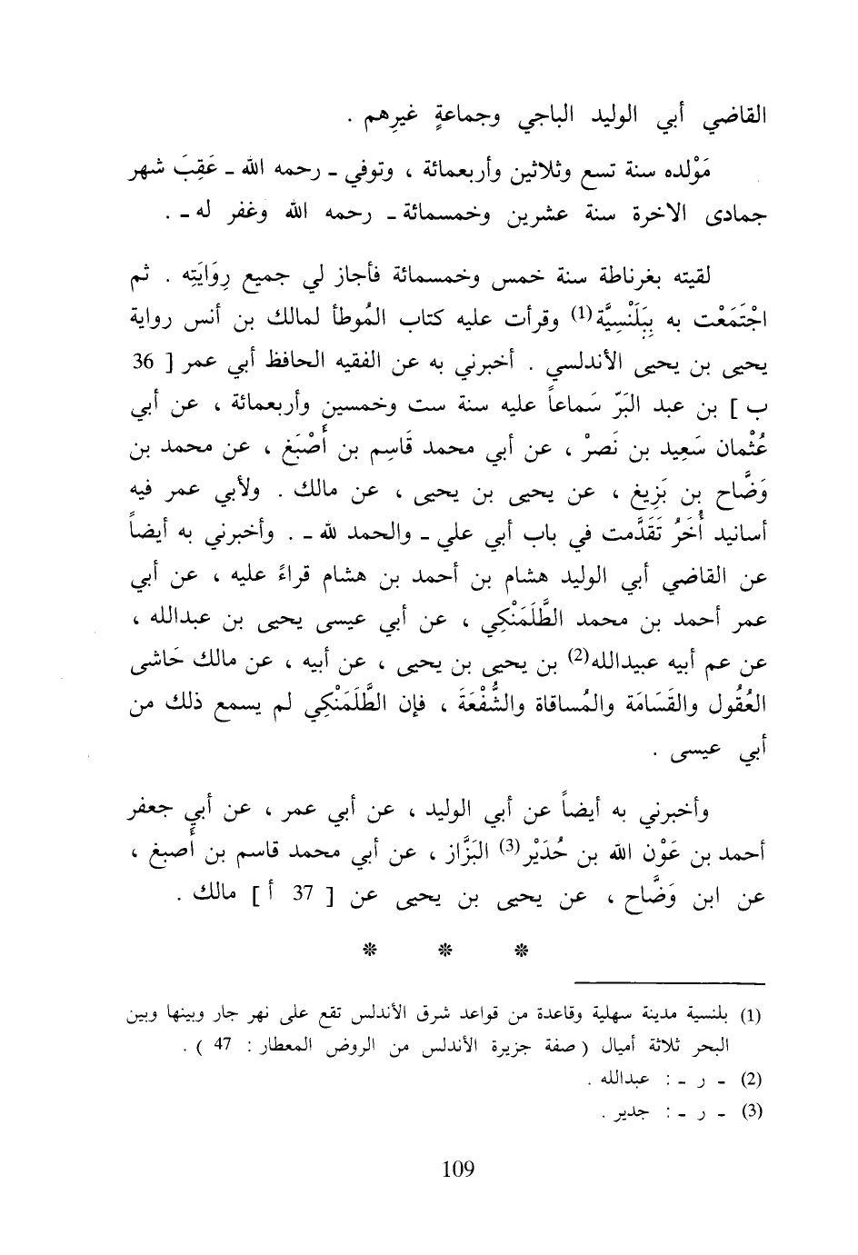 وَأَخْبرنِي بِهِ أَيْضا عَن أبي الْوَلِيد عَن أبي عمر عَن أبي جَعْفَر أَحْمد بن عون الله بن حدير الْبَزَّاز عَن أبي مُحَمَّد قَاسم بن أصبغ عَن ابْن وضاح عَن يحيى بن يحيى عَن مَالك