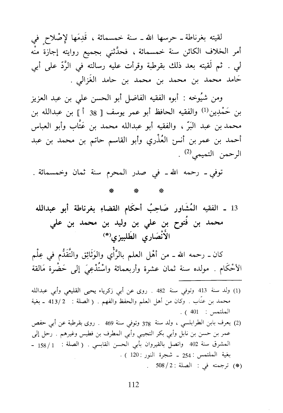 13 - الْفَقِيه المشاور صَاحب أَحْكَام الْقَضَاء بغرناطة أَبُو عبد الله مُحَمَّد بن فتوح بن عَليّ بن وليد بن مُحَمَّد بن عَليّ الْأنْصَارِيّ الطلبيزي