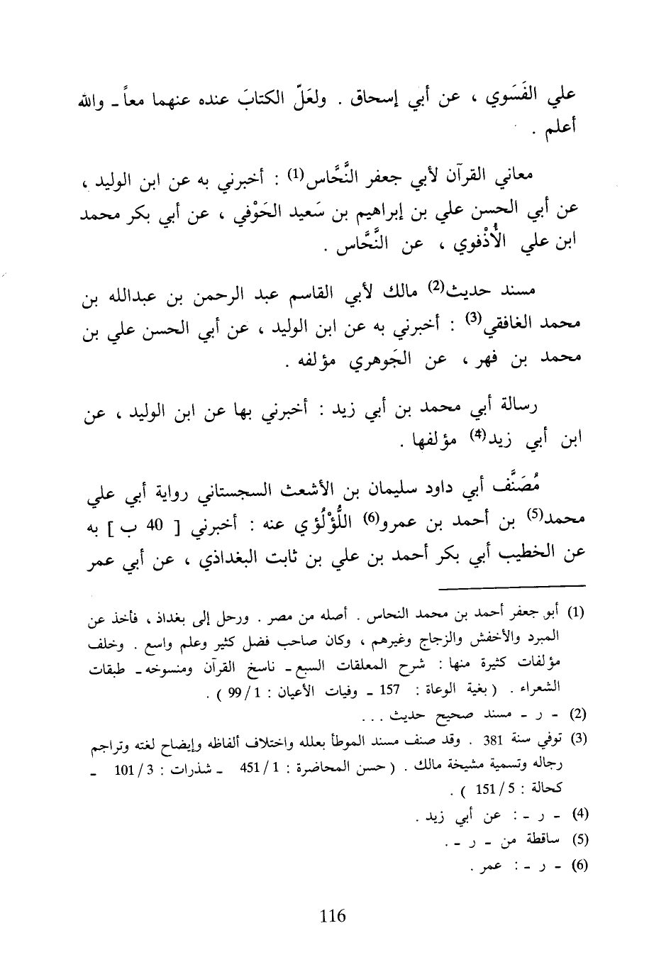 مَعَاني الْقُرْآن لأبي جَعْفَر النّحاس أَخْبرنِي بِهِ عَن ابْن الْوَلِيد عَن أبي الْحسن عَليّ بن إِبْرَاهِيم بن سعيد الحوفي عَن أبي بكر مُحَمَّد ابْن عَليّ الأذفوي عَن النّحاس