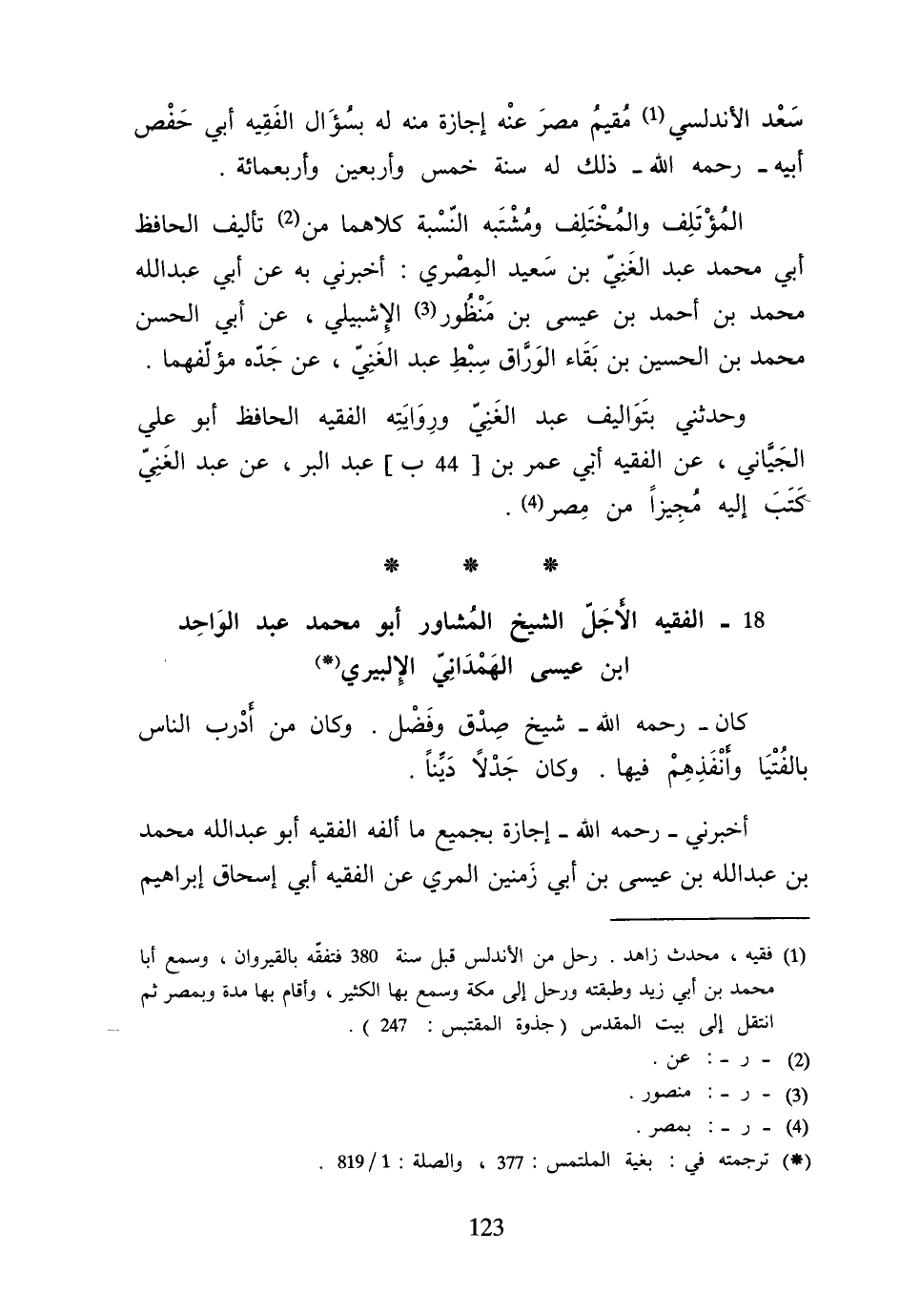 المؤتلف والمختلف ومشتبه النِّسْبَة كِلَاهُمَا من تأليف الْحَافِظ أبي مُحَمَّد عبد الْغَنِيّ بن سعيد الْمصْرِيّ أَخْبرنِي بِهِ عَن أبي عبد الله مُحَمَّد بن أَحْمد بن عِيسَى بن مَنْظُور الإشبيلي عَن أبي الْحسن مُحَمَّد بن الْحُسَيْن بن بَقَاء الْوراق سبط عبد الْغَنِيّ عَن جده مؤلفهما