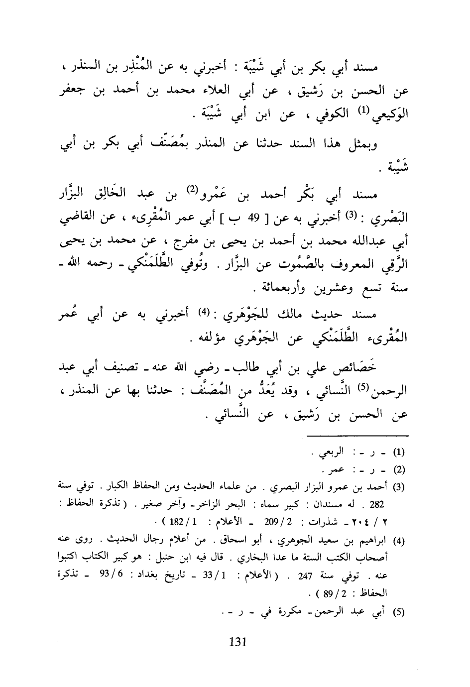 مُسْند أبي بكر بن أبي شيبَة أَخْبرنِي بِهِ عَن الْمُنْذر بن الْمُنْذر عَن الْحسن بن رَشِيق عَن أبي الْعَلَاء مُحَمَّد بن أَحْمد بن جَعْفَر الوكيعي الْكُوفِي عَن ابْن أبي شيبَة