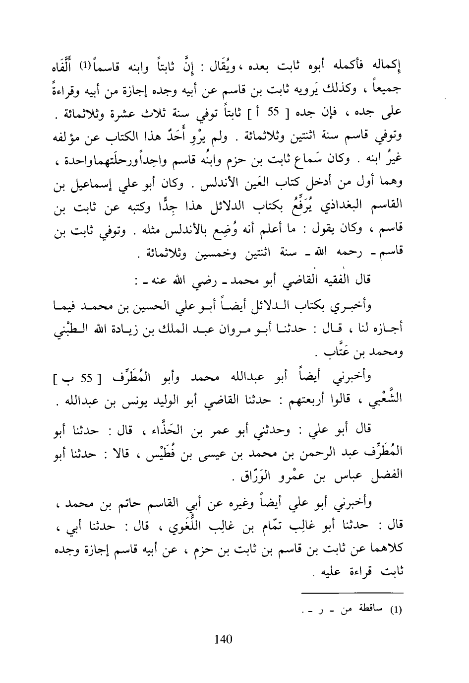 إكماله فأكمله أَبوهُ ثَابت بعده وَيُقَال إِن ثَابتا وَابْنه قاسما ألفاه جَمِيعًا وَكَذَلِكَ يرويهِ ثَابت بن قَاسم عَن أَبِيه وجده إجَازَة من أَبِيه وَقِرَاءَة على جده فَإِن جده ثَابتا توفّي سنة ثَلَاث عشرَة وثلاثمائة وَتُوفِّي قَاسم سنة اثْنَتَيْنِ وثلاثمائة وَلم يرو أحد هَذَا الْكتاب عَن مُؤَلفه غير ابْنه وَكَانَ سَماع ثَابت بن حزم وَابْنه قَاسم وَاحِدًا ورحلتهما وَاحِدَة وهما أول من أَدخل كتاب الْعين الأندلس وَكَانَ أَبُو عَليّ إِسْمَاعِيل بن الْقَاسِم البغداذي يرفع بِكِتَاب الدَّلَائِل هَذَا جدا وَكتبه عَن ثَابت بن قَاسم وَكَانَ يَقُول مَا أعلم أَنه وضع بالأندلس مثله وَتُوفِّي ثَابت بن قَاسم رَحمَه الله سنة اثْنَتَيْنِ وَخمسين وثلاثمائة