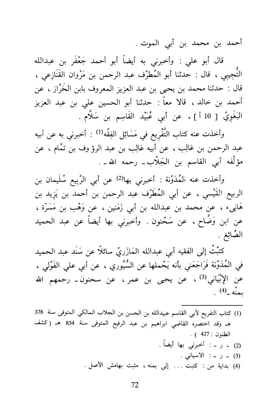 قَالَ أَبُو عَليّ وَأَخْبرنِي بِهِ أَيْضا أَبُو أَحْمد جَعْفَر بن عبد الله النجيبي قَالَ حَدثنَا أَبُو الْمطرف عبد الرَّحْمَن بن مَرْوَان القنازعي قَالَ حَدثنَا مُحَمَّد بن يحيى بن عبد الْعَزِيز الْمَعْرُوف بِابْن الخراز عَن أَحْمد بن خَالِد قَالَا مَعًا حَدثنَا أَبُو الْحُسَيْن عَليّ بن عبد الْعَزِيز الْبَغَوِيّ عَن أبي عبيد الْقَاسِم بن سَلام
