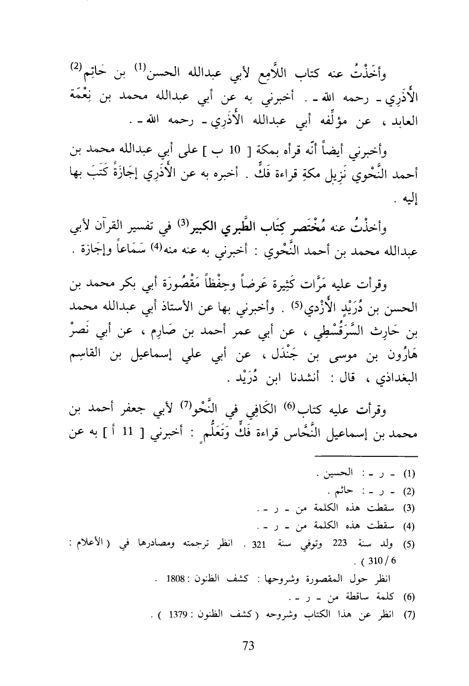 وَأَخْبرنِي أَيْضا أَنه قَرَأَهُ بِمَكَّة على أبي عبد الله مُحَمَّد بن أَحْمد النَّحْوِيّ نزيل مَكَّة قِرَاءَة فك أخبرهُ بِهِ عَن الأذري إجَازَة كتب بهَا إِلَيْهِ