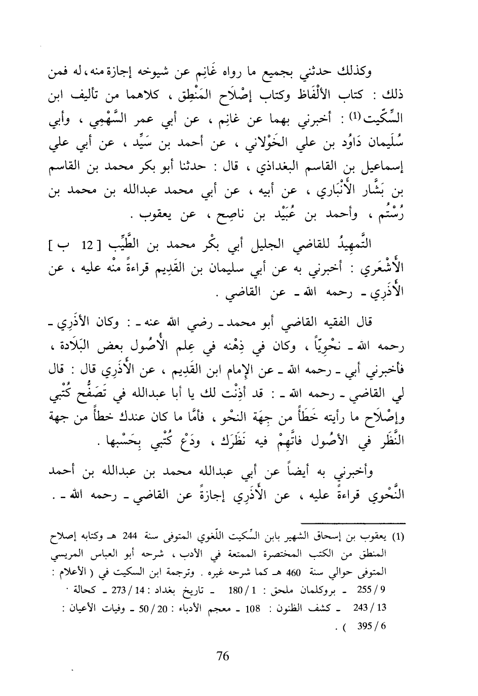 وَكَذَلِكَ حَدثنِي بِجَمِيعِ مَا رَوَاهُ غَانِم عَن شُيُوخه إجَازَة مِنْهُ لَهُ فَمن ذَلِك كتاب الْأَلْفَاظ وَكتاب إصْلَاح الْمنطق كِلَاهُمَا من تأليف ابْن السّكيت أَخْبرنِي بهما عَن غَانِم عَن أبي عمر السَّهْمِي وَأبي سُلَيْمَان دَاوُد بن عَليّ الْخَولَانِيّ عَن أَحْمد بن سيد عَن أبي عَليّ إِسْمَاعِيل بن الْقَاسِم البغداذي قَالَ حَدثنَا أَبُو بكر مُحَمَّد بن الْقَاسِم بن بشار الْأَنْبَارِي عَن أَبِيه عَن أبي مُحَمَّد عبد الله بن مُحَمَّد بن رستم وَأحمد بن عبيد بن نَاصح عَن يَعْقُوب