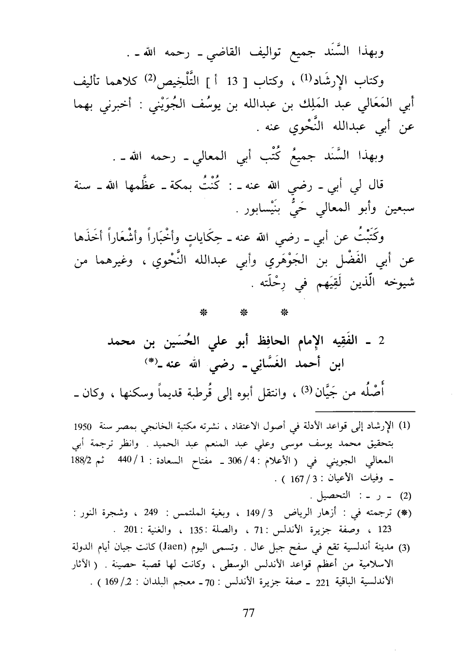وَكتاب الْإِرْشَاد وَكتاب التَّلْخِيص كِلَاهُمَا تأليف أبي الْمَعَالِي عبد الْملك بن عبد الله بن يُوسُف الْجُوَيْنِيّ أَخْبرنِي بهما عَن أبي عبد الله النَّحْوِيّ عَنهُ