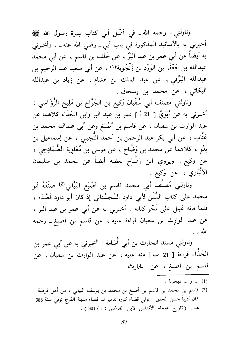 وناولني رَحمَه الله فِي أصل أبي كتاب سيرة رَسُول الله صلى الله عَلَيْهِ وَسلم أَخْبرنِي بِهِ بِالْأَسَانِيدِ الْمَذْكُورَة فِي بَاب أبي رَضِي الله عَنهُ وَأَخْبرنِي بِهِ أَيْضا عَن أبي عمر بن عبد الْبر عَن خلف بن قَاسم عَن أبي مُحَمَّد عبد الله بن جَعْفَر بن الْورْد بن زنجوية عَن أبي سعيد عبد الرَّحِيم بن عبد الله البرقي عَن عبد الْملك بن هِشَام عَن زِيَاد بن عبد الله البكائي عَن مُحَمَّد بن إِسْحَاق
