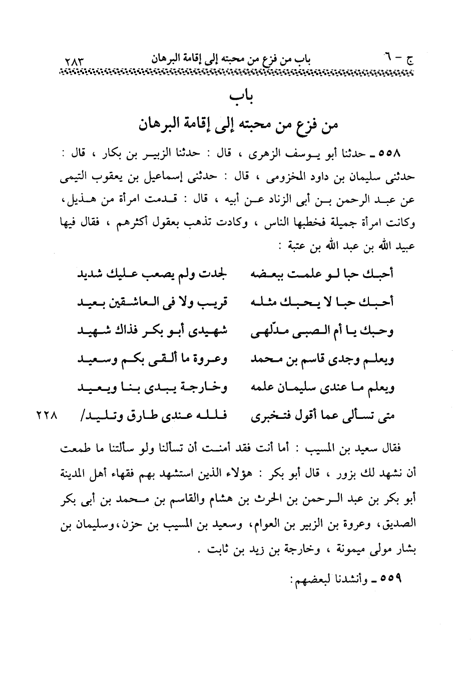 558 - حَدَّثَنَا أَبُو يُوسُفَ الزُّهْرِيُّ قَالَ: حَدَّثَنَا الزُّبَيْرُ بْنُ بَكَّارٍ قَالَ: حَدَّثَنِي سُلَيْمَانُ بْنُ دَاوُدَ الْمَخْزُومِيُّ قَالَ: حَدَّثَنِي إِسْمَاعِيلُ بْنُ يَعْقُوبَ التَّيْمِيُّ , عَنْ عَبْدِ الرَّحْمَنِ بْنِ أَبِي الزِّنَادِ , عَنْ أَبِيهِ قَالَ: قَدِمَتِ امْرَأَةٌ مِنْ هُذَيْلٍ , وَكَانَتِ امْرَأَةٌ جَمِلَيةٌ فَخَطَبَهَا النَّاسُ , وَكَادَتْ تَذْهَبُ بِعُقُولِ أَكْثَرِهِمْ , فَقَالَ فِيهَا عُبَيْدُ اللَّهِ بْنُ عَبْدِ اللَّهِ بْنِ عُتْبَةَ: "