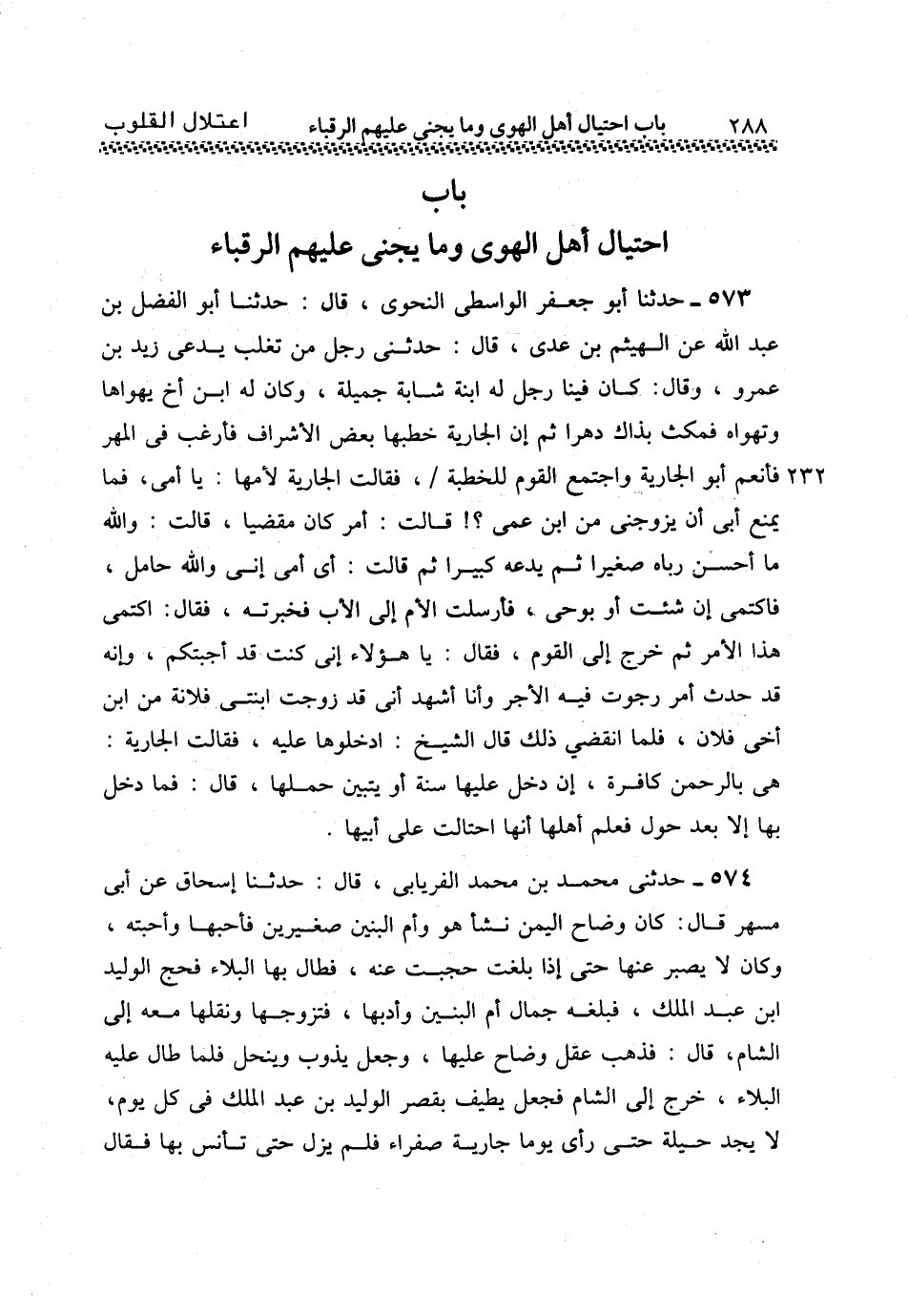 573 - حَدَّثَنَا أَبُو جَعْفَرٍ الْوَاسِطِيُّ النَّحْوِيُّ قَالَ: حَدَّثَنَا أَبُو الْفَضْلِ بْنُ عَبْدِ اللَّهِ , عَنِ الْهَيْثَمِ بْنِ عَدِيٍّ قَالَ: حَدَّثَنِي رَجُلٌ مِنْ تَغْلِبَ يُدْعَى زَيْدَ بْنَ عَمْرٍو , وَقَالَ: " كَانَ فِينَا رَجُلٌ لَهُ ابْنَةٌ شَابَّةٌ جَمِيلَةٌ , وَكَانَ لَهُ ابْنُ أَخٍ يَهْوَاهَا وَتَهْوَاهُ , فَمَكَثَ بِذَاكَ دَهْرًا , ثُمَّ إِنَّ الْجَارِيَةَ خَطَبَهَا بَعْضُ الْأَشْرَافِ فَأَرْغَبَ فِي الْمَهْرَ , فَأَنْعَمَ أَبُو الْجَارِيَةِ , وَاجْتَمَعَ الْقَوْمُ لِلْخِطْبَةِ , فَقَالَتِ الْجَارِيَةُ لِأُمِّهَا: يَا أُمِّي , فَمَا يَمْنَعُ أَبِي أَنْ يُزَوِّجَنِي مِنَ ابْنِ عَمِّي؟ قَالَتْ: أَمْرٌ كَانَ مَقْضِيًّا قَالَتْ: وَاللَّهِ مَا أَحْسَنَ , رَبَّاهُ صَغِيرًا , ثُمَّ يَدَعُهُ كَبِيرًا , ثُمَّ قَالَتْ: أَيْ أُمِّي , إِنِّي وَاللَّهِ حَامِلٌ , فَاكْتُمِي إِنْ شِئْتِ أَوْ بُوحِي , فَأَرْسَلَتِ الْأُمُّ إِلَى الْأَبِ فَخَبَّرَتْهُ , فَقَالَ: اكْتُمِي هَذَا الْأَمْرَ , ثُمَّ خَرَجَ إِلَى الْقَوْمِ , فَقَالَ: يَا هَؤُلَاءِ , إِنِّي كُنْتُ قَدْ أَجَبْتُكُمْ , إِنَّهُ قَدْ حَدَثَ أَمْرٌ رَجَوْتُ فِيهِ الْأَجْرَ , §وَأَنَا أَشْهَدُ أَنَّى قَدْ زَوَّجَتُ ابْنَتِي فُلَانَةَ ابْنَ أَخِي فُلَانًا , فَلَمَّا انْقَضَى ذَلِكَ قَالَ الشَّيْخُ: أَدْخِلُوهَا عَلَيْهِ , فَقَالَتِ الْجَارِيَةُ: هِيَ بِالرَّحْمَنِ كَافِرَةٌ إِنْ دَخَلَ عَلَيْهَا سَنَةً أَوْ يَتَبَيَّنُ حَمْلُهَا قَالَ: فَمَا دَخَلَ بِهَا إِلَّا بَعْدَ حَوْلٍ , فَعَلِمَ أَهْلُهَا أَنَّهَا احْتَالَتْ عَلَى أَبِيهَا "