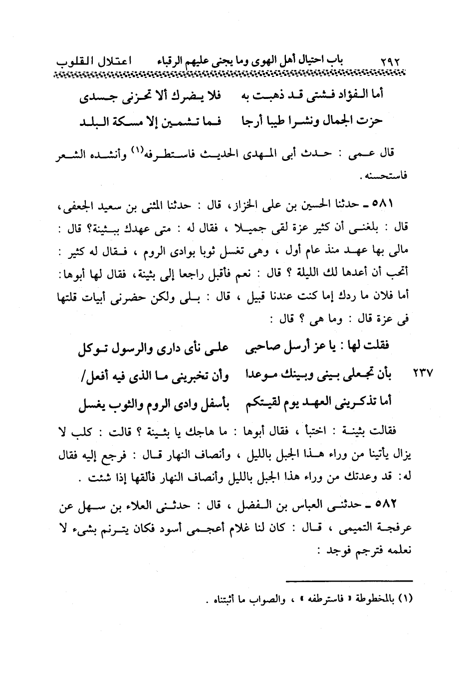 581 - حَدَّثَنَا الْحُسَيْنُ بْنُ عَلِيٍّ الْخَزَّازُ قَالَ: حَدَّثَنَا الْمُثَنَّى بْنُ سَعِيدٍ الْجُعْفِيُّ قَالَ: بَلَغَنِي أَنَّ كُثَيِّرَ عَزَّةَ لَقِيَ جَمِيلًا , فَقَالَ لَهُ: مَتَى عَهْدُكَ بِبُثَيْنَةَ؟ قَالَ: مَالِي بِهَا عَهْدٌ مُنْذُ عَامِ أَوَّلَ وَهِيَ تَغْسِلُ ثَوْبًا بِوَادِي الرُّومِ , فَقَالَ لَهُ كُثَيِّرٌ: §أَتُحِبُّ أَنْ أَعِدَهَا لَكَ اللَّيْلَةَ؟ قَالَ: نَعَمْ , فَأَقْبَلَ إِلَى بُثَيْنَةَ , فَقَالَ لَهُ أَبُوهَا: أَيَا فُلَانٌ , مَا رَدَّكَ؟ أَمَا كُنْتَ عِنْدَنَا قَبِيلٌ؟ قَالَ: بَلَى , وَلَكِنْ أَحْضَرَنِي أَبْيَاتٌ قُلْتُهَا فِي عَزَّةَ قَالَ: وَمَا هِيَ؟ قَالَ:
