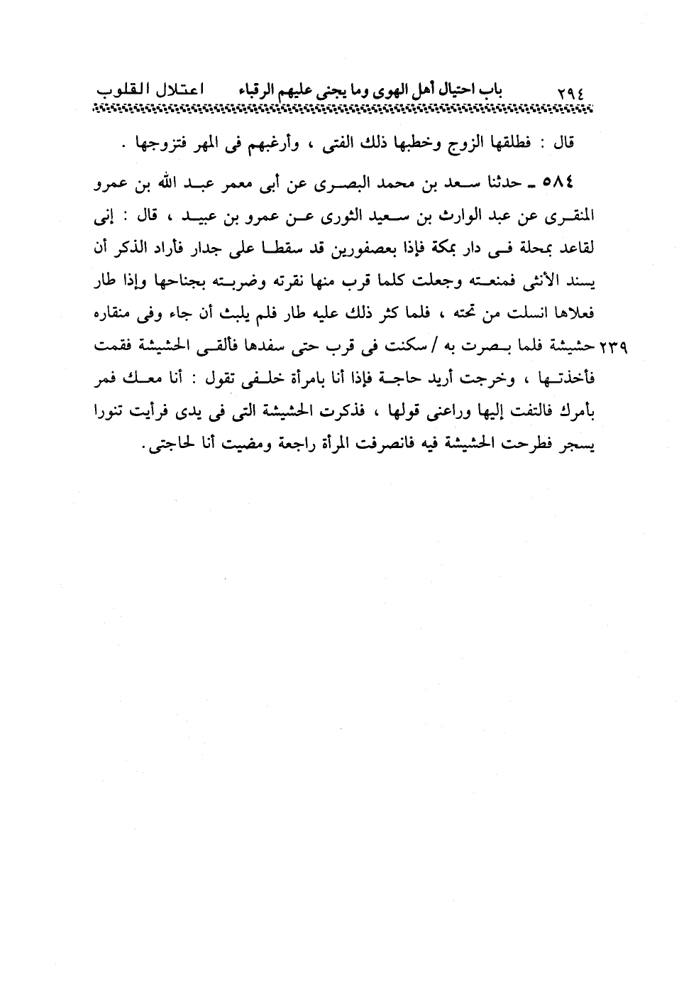 584 - حَدَّثَنَا سَعْدُ بْنُ مُحَمَّدٍ الْبَصْرِيُّ , عَنْ أَبِي مَعْمَرٍ عَبْدِ اللَّهِ بْنِ عَمْرٍو الْمِنْقَرِيِّ , عَنْ عَبْدِ الْوَارِثِ بْنِ سَعِيدٍ التَنُّورٍي , عَنْ عَمْرِو بْنِ عُبَيْدٍ قَالَ: §إِنِّي لَقَاعِدٌ بِمَحِلَّةٍ فِي دَارٍ بِمَكَّةَ فَإِذَا بِعُصْفُورَيْنِ قَدْ سَقَطَا عَلَى جِدَارٍ فَأَرَادَ الذَّكَرُ أَنْ يَسْفِدَ الْأُنْثَى فَمَنَعَتْهُ وَجَعَلَتْ كُلَّمَا قَرُبَ مِنْهَا نَقَرَتْهُ وَضَرَبَتْهُ بِجَنَاحِهَا , وَإِذَا طَارَ فَعَلَاهَا انْسَلَّتْ مِنْ تَحْتِهِ , فَلَمَّا كَثُرَ ذَلِكَ عَلَيْهِ طَارَ فَلَمْ يَلْبَثْ أَنْ جَاءَ وَفِي مِنْقَارِهِ حَشِيشَةٌ , فَلَمَّا بَصُرْتُ بِهِ سَكَنَتْ فِي قُرْبٍ حَتَّى سَفَدَهَا فَأَلْقَى الْحَشِيشَةَ , فَقُمْتُ فَأَخَذْتُهَا , وَخَرَجْتُ أُرِيدُ حَاجَةً , فَإِذَا أَنَا بِامْرَأَةٍ خَلْفِي تَقُولُ: أَنَا مَعَكَ , فَمُرْ بِأَمْرِكِ , فَالْتَفَتُّ إِلَيْهَا وَرَاعَنِي قَوْلُهَا , فَذَكَرْتُ الْحَشِيشَةَ الَّتِي فِي يَدِي , فَرَأَيْتُ تَنُّورًا يُسْجَرُ فَطَرَحْتُ الْحَشِيشَةَ فِيهِ , فَانْصَرَفَتِ الْمَرْأَةُ رَاجِعَةً , وَمَضَيْتُ أَنَا لِحَاجَتِي