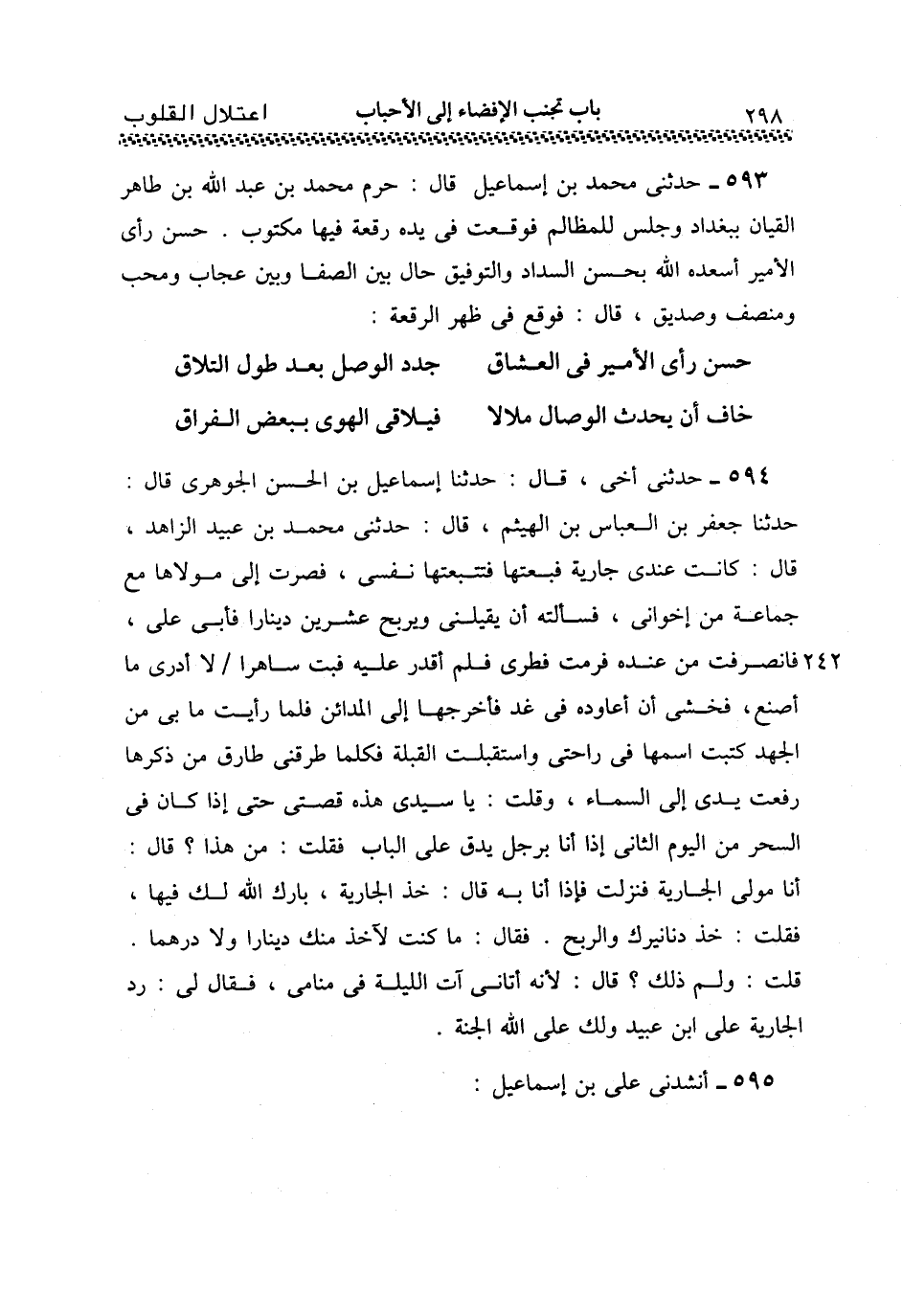 594 - حَدَّثَنِي أَخِي قَالَ: حَدَّثَنَا إِسْمَاعِيلُ بْنُ الْحَسَنِ الْجَوْهَرِيُّ قَالَ: حَدَّثَنَا جَعْفَرُ بْنُ الْعَبَّاسِ بْنِ الْهَيْثَمِ قَالَ: حَدَّثَنِي مُحَمَّدُ بْنُ عُبَيْدٍ الزَّاهِدُ قَالَ: كَانَتْ عِنْدِي جَارِيَةٌ فَبِعْتُهَا فَتَتَبَّعَتْهَا نَفْسِي , فَصِرْتُ إِلَى مَوْلَاهَا مَعَ جَمَاعَةٍ مِنْ إِخْوَانِي , فَسَأَلْتُهُ أَنْ يُقِيلَنِي وَيَرْبَحَ عِشْرِينَ دِينَارًا , فَأَبَى عَلَيَّ , فَانْصَرَفْتُ مِنْ عِنْدِهُ , فَرُمْتُ فِطْرِي فَلَمْ أَقْدِرْ عَلَيْهِ , فَبِتُّ سَاهِرًا لَا أَدْرِي مَا أَصْنَعُ , فَخَشِيَ أَنْ أُعَاوِدَهُ فِي غَدٍ فَأَخْرَجَهَا إِلَى الْمَدَائِنِ , فَلَمَّا رَأَيْتُ مَا بِي مِنَ الْجَهْدِ كَتَبْتُ اسْمَهَا فِي رَاحَتِي وَاسْتَقْبَلَتُ الْقِبْلَةَ , فَكُلَّمَا طَرَقَنِي طَارِقٌ مِنْ ذِكْرِهَا رَفَعْتُ يَدَيَّ إِلَى السَّمَاءِ , وَقُلْتُ: §يَا سَيِّدِي , هَذِهِ قِصَّتِي , حَتَّى إِذَا كَانَ فِي السَّحَرِ مِنَ الْيَوْمِ الثَّانِي إِذَا أَنَا بِرَجُلٍ يَدُقُّ عَلَيَّ الْبَابَ , فَقُلْتُ: مَنْ هَذَا؟ قَالَ: أَنَا مَوْلَى الْجَارِيَةِ , فَنَزَلْتُ فَإِذَا أَنَا بِهِ قَالَ: خُذِ الْجَارِيَةَ , بَارَكَ اللَّهُ لَكَ فِيهَا , فَقُلْتُ: خُذْ دَنَانِيرَكَ وَالرِّبْحَ. فَقَالَ: مَا كُنْتُ لِآخُذَ مِنْكَ دِينَارًا وَلَا دِرْهَمًا. قُلْتُ: وَلِمَ ذَلِكَ؟ قَالَ: لِأَنَّهُ أَتَانِي آتٍ اللَّيْلَةَ فِي مَنَامِي فَقَالَ لِي: رُدَّ الْجَارِيَةَ عَلَى ابْنِ عُبَيْدٍ , وَلَكَ عَلَى اللَّهِ الْجَنَّةُ