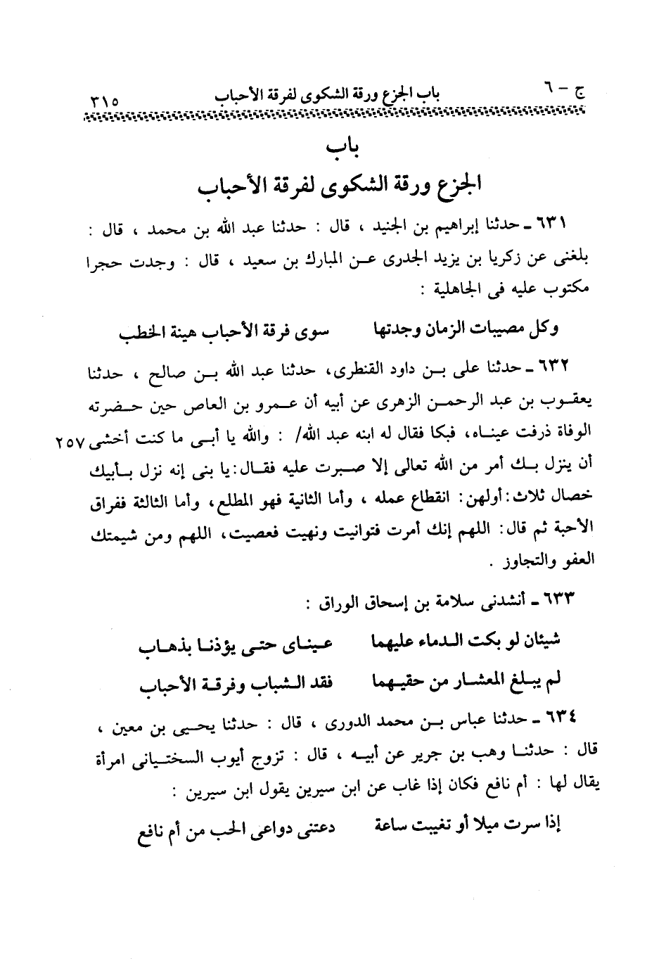 §بَابُ الْجَزَعِ وَرَقَةِ الشَّكْوَى لِفُرْقَةِ الْأَحْبَابِ