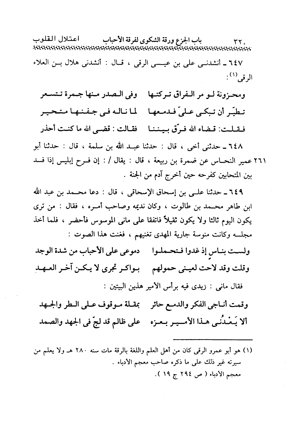647 - أَنْشَدَنِي عَلِيُّ بْنُ عِيسَى الرَّقِّي قَالَ: أَنْشَدَنِي هِلَالُ بْنُ الْعَلَاءِ الرَّقِّيُّ:
