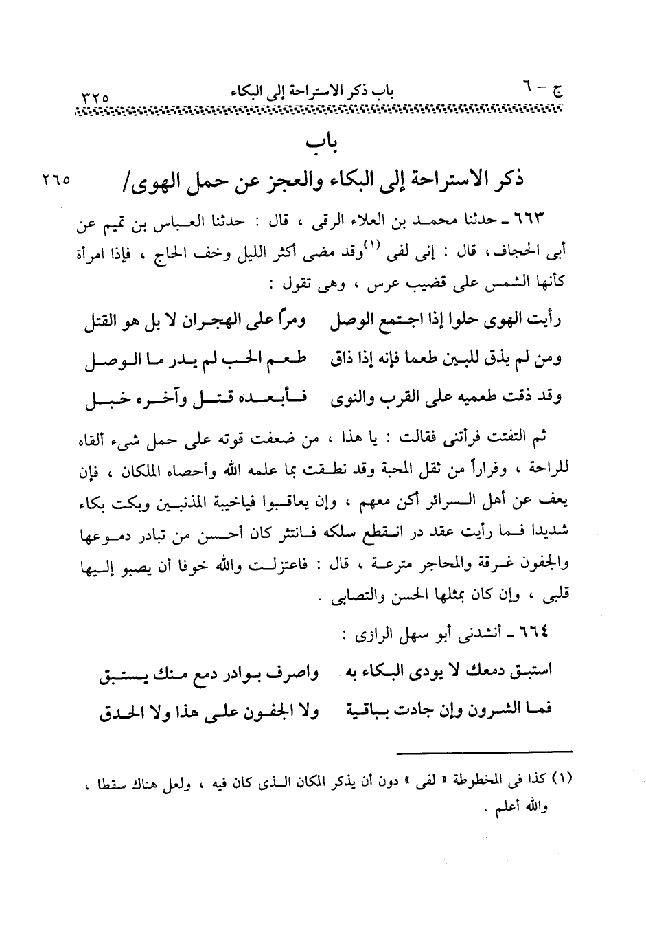 §بَابُ ذِكْرُ الِاسْتِرَاحَةِ إِلَى الْبُكَاءِ وَالْعَجْزِ عَنْ حَمْلِ الْهَوَى