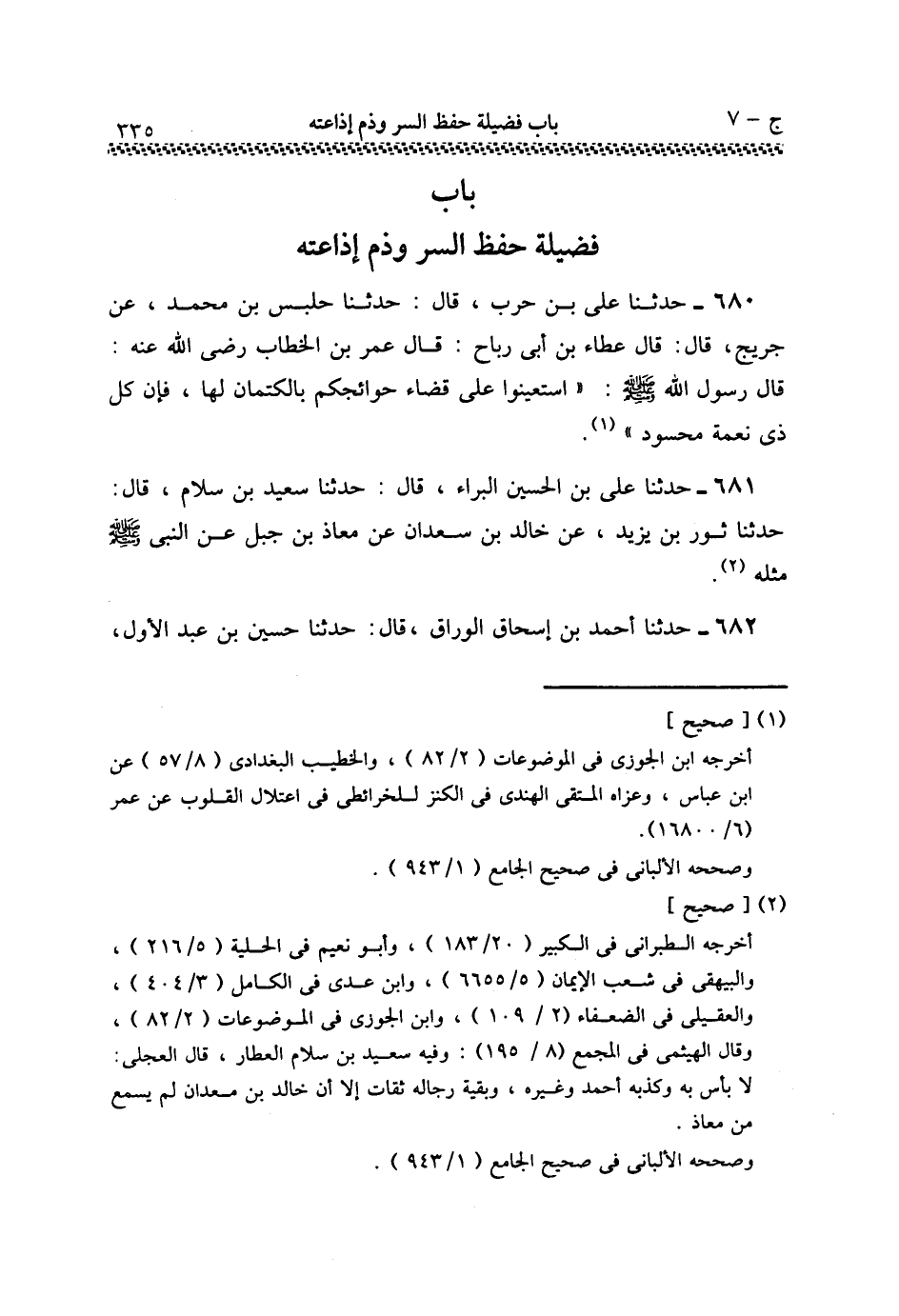 680 - حَدَّثَنَا عَلِيُّ بْنُ حَرْبٍ قَالَ: حَدَّثَنَا حَلْبَسُ بْنُ مُحَمَّدٍ , عَنْ جُرَيْجٍ قَالَ: قَالَ عَطَاءُ بْنُ أَبِي رَبَاحٍ: قَالَ عُمَرُ بْنُ الْخَطَّابِ رَضِيَ اللَّهُ عَنْهُ: قَالَ رَسُولُ اللَّهِ صَلَّى اللهُ عَلَيْهِ وَسَلَّمَ: «§اسْتَعِينُوا عَلَى قَضَاءِ حَوَائِجِكُمْ بِالْكِتْمَانِ لَهَا؛ فَإِنَّ كُلَّ ذِي نِعْمَةٍ مَحْسُودٌ» حَدَّثَنَا عَلِيُّ بْنُ الْحُسَيْنِ الْبَرَاءُ قَالَ: حَدَّثَنَا سَعِيدُ بْنُ سَلَّامٍ قَالَ: حَدَّثَنَا ثَوْرُ بْنُ يَزِيدَ , عَنْ خَالِدِ بْنِ مَعْدَانَ , عَنْ مُعَاذِ بْنِ جَبَلٍ , عَنِ النَّبِيِّ صَلَّى اللهُ عَلَيْهِ وَسَلَّمَ مِثْلَهُ
