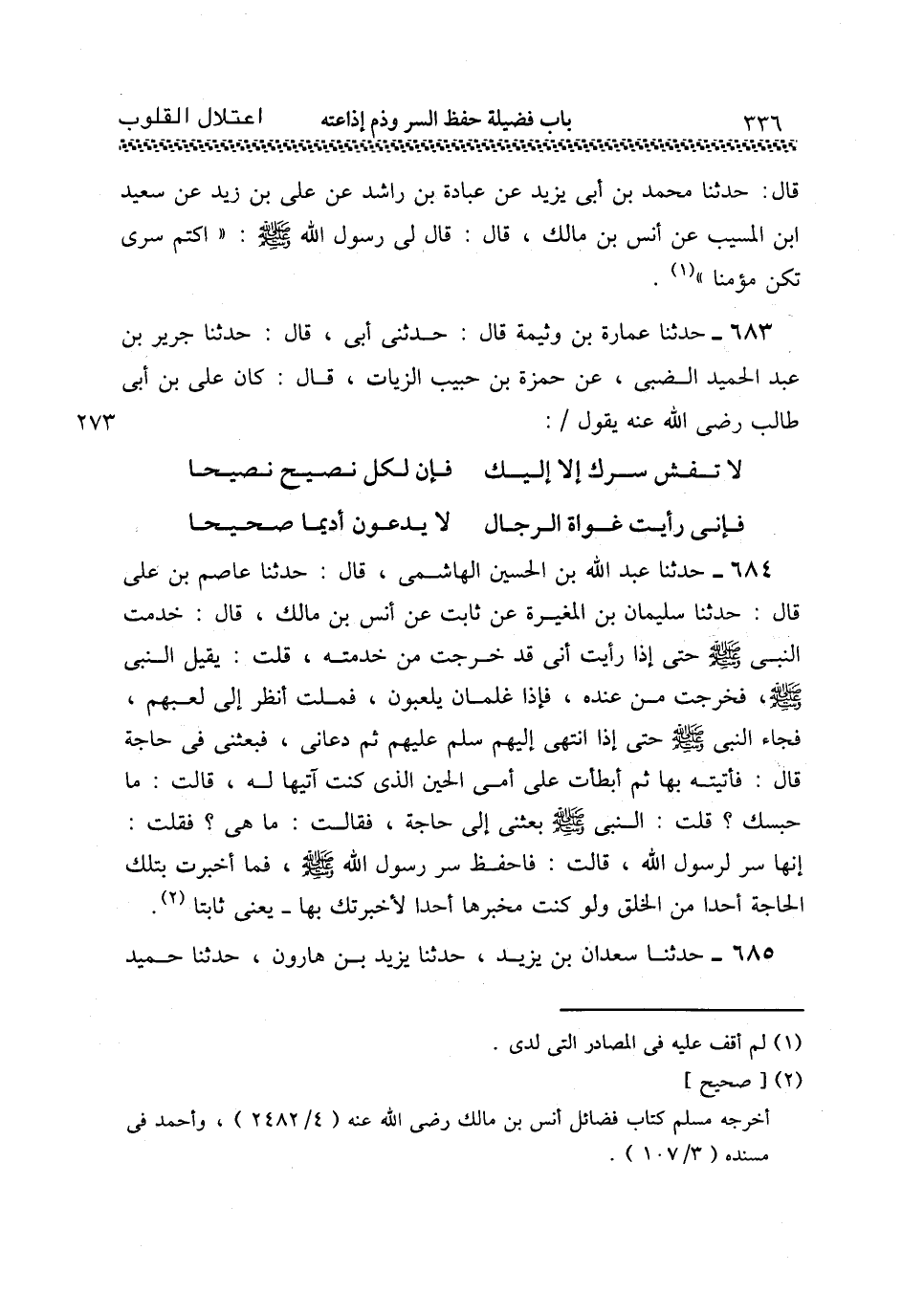 684 - حَدَّثَنَا عَبْدُ اللَّهِ بْنُ الْحُسَيْنِ الْهَاشِمِيُّ قَالَ: حَدَّثَنَا عَاصِمُ بْنُ عَلِيٍّ قَالَ: حَدَّثَنَا سُلَيْمَانُ بْنُ الْمُغِيرَةِ , عَنْ ثَابِتٍ , عَنْ أَنَسِ بْنِ مَالِكٍ قَالَ: خَدَمْتُ النَّبِيَّ صَلَّى اللهُ عَلَيْهِ وَسَلَّمَ حَتَّى إِذَا رَأَيْتُ أَنِّي قَدْ خَرَجْتُ مِنْ خِدْمَتِهِ قُلْتُ: يَقِيلُ النَّبِيُّ صَلَّى اللهُ عَلَيْهِ وَسَلَّمَ , فَخَرَجْتُ مِنْ عِنْدِهِ , فَإِذَا غِلْمَانٌ يَلْعَبُونَ , فَمِلْتُ أَنْظُرُ إِلَى لَعِبِهِمْ , فَجَاءَ النَّبِيُّ صَلَّى اللهُ عَلَيْهِ وَسَلَّمَ حَتَّى إِذَا انْتَهَى سَلَّمَ عَلَيْهِمْ , ثُمَّ دَعَانِي فَبَعَثَنِي فِي حَاجَةٍ. قَالَ: فَأَتَيْتُهُ لَهَا ثُمَّ أَبْطَأْتُ عَلَى أُمِّي الْحِينَ الَّذِي كُنْتُ آتِيهَا لَهُ قَالَتْ: مَا حَبَسَكَ؟ قُلْتُ: النَّبِيُّ صَلَّى اللهُ عَلَيْهِ وَسَلَّمَ بَعَثَنِي إِلَى حَاجَةٍ , فَقَالَتْ: مَا هِيَ؟ فَقُلْتُ: إِنَّهَا سِرٌّ لِرَسُولِ اللَّهِ قَالَتْ: §فَاحْفَظْ سِرَّ رَسُولِ اللَّهِ صَلَّى اللهُ عَلَيْهِ وَسَلَّمَ فَمَا أَخْبَرْتُ بِتِلْكَ الْحَاجَةِ أَحَدًا مِنَ الْخَلْقِ , وَلَوْ كُنْتُ مُخْبِرَهَا أَحَدًا لَأَخْبَرْتُكَ بِهَا. يَعْنِي ثَابِتًا