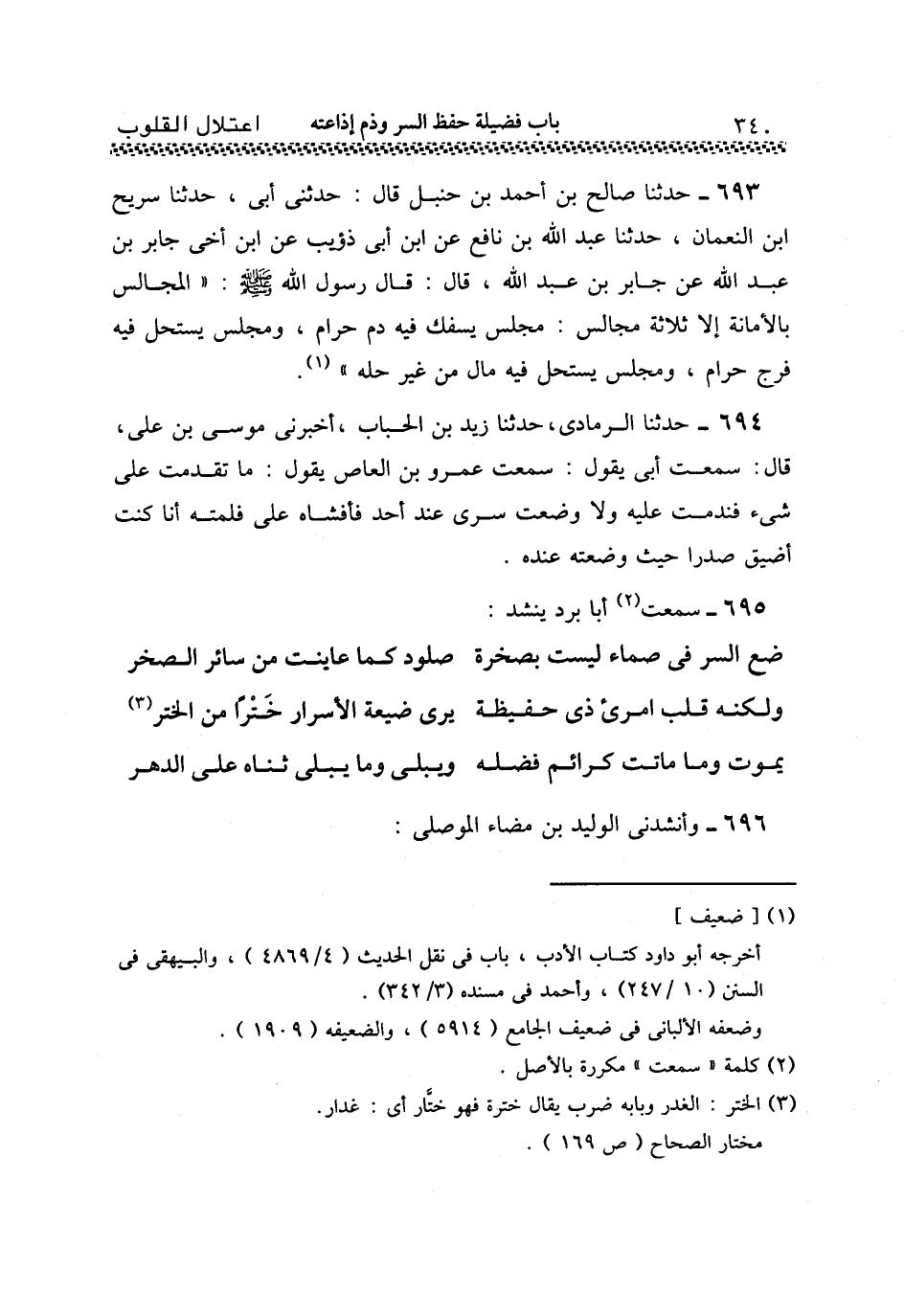 694 - حَدَّثَنَا الرَّمَادِيُّ , حَدَّثَنَا زَيْدُ بْنُ الْحُبَابِ , أَخْبَرَنِي مُوسَى بْنُ عَلِيٍّ قَالَ: سَمِعْتُ أَبِي يَقُولُ: سَمِعْتُ عَمْرَو بْنَ الْعَاصِ يَقُولُ: «§مَا تَقَدَّمْتُ عَلَى شَيْءٍ فَنَدِمْتُ عَلَيْهِ , وَلَا وَضَعْتُ سِرِّي عِنْدَ أَحَدٍ فَأَفْشَاهُ عَلَيَّ فَلُمْتُهُ , أَنَا كُنْتُ أَضْيَقَ صَدْرًا حَيْثُ وَضَعْتُهُ عِنْدَهُ»