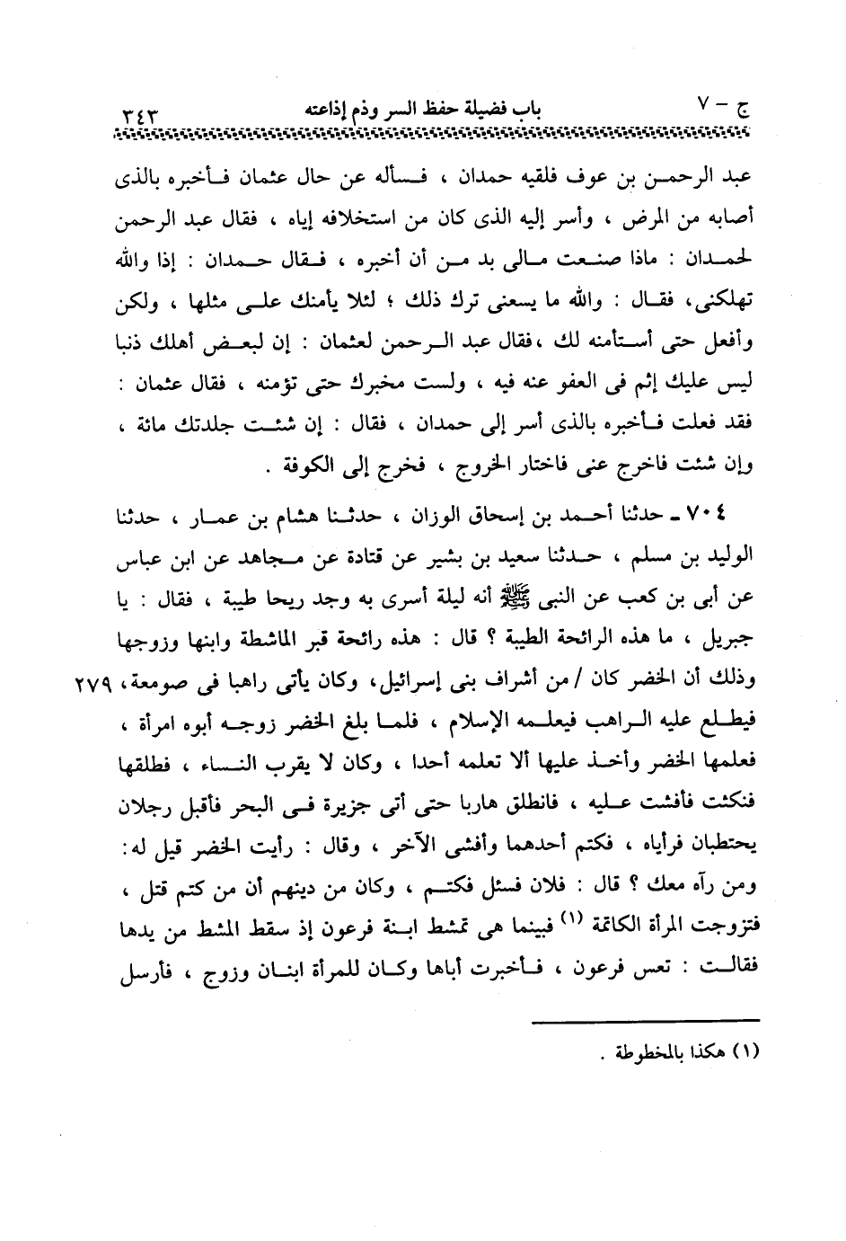 704 - حَدَّثَنَا أَحْمَدُ بْنُ إِسْحَاقَ الْوَزَّانُ , حَدَّثَنَا هِشَامُ بْنُ عَمَّارٍ , حَدَّثَنَا الْوَلِيدُ بْنُ مُسْلِمٍ , حَدَّثَنَا سَعِيدُ بْنُ بَشِيرٍ , عَنْ قَتَادَةَ , عَنْ مُجَاهِدٍ , عَنِ ابْنِ عَبَّاسٍ , عَنِ أُبَيِّ بْنِ كَعْبٍ , عَنِ النَّبِيِّ صَلَّى اللهُ عَلَيْهِ وَسَلَّمَ أَنَّهُ لَيْلَةَ أُسْرِيَ بِهِ وَجَدَ رِيحًا طَيِّبَةً , فَقَالَ: §يَا جِبْرِيلُ , مَا هَذِهِ الرَّائِحَةُ الطَّيِّبَةُ؟ قَالَ: هَذِهِ رَائِحَةُ قَبْرِ الْمَاشِطَةِ وَابْنِهَا وَزَوْجِهَا , وَذَلِكَ أَنَّ الْخَضِرَ كَانَ مِنْ أَشْرَافِ بَنِي إِسْرَائِيلَ , وَكَانَ يَأْتِي رَاهِبًا فِي صَوْمَعَةٍ فَيَطَّلِعُ عَلَيْهِ الرَّاهِبُ فَيُعَلِّمُهُ الْإِسْلَامَ , فَلَمَّا بَلَغَ الْخَضِرَ زَوَّجَهُ أَبُوهُ امْرَأَةً , فَعَلَّمَهَا الْخَضِرُ وَأَخَذَ عَلَيْهَا أَلَا تُعَلِّمَهُ أَحَدًا , وَكَانَ لَا يَقْرَبُ النِّسَاءَ , فَطَلَّقَهَا فَنَكَثَتْ فَأَفْشَتْ عَلَيْهِ , فَانْطَلَقَ هَارِبًا حَتَّى أَتَى جَزِيرَةً فِي الْبَحْرِ , فَأَقْبَلَ رَجُلَانِ يَحْتَطِبَانِ فَرَأَيَاهُ , فَكَتَمَ أَحَدُهُمَا وَأَفْشَى الْآخَرُ , وَقَالَ: رَأَيْتُ الْخَضِرَ , قِيلَ لَهُ: وِمَنْ رَآهُ مَعَكَ؟ قَالَ: فُلَانٌ , فَسُئِلَ فَكَتَمَ , وَكَانَ مِنْ دِينِهِمْ أَنَّ مَنَ كَتَمَ قُتِلَ , فَتَزَوَّجَتِ الْمَرْأَةُ الْكَاتِمَةُ , فَبَيْنَمَا هِيَ تَمْشُطُ ابْنَةَ فِرْعَوْنَ إِذْ سَقَطَ الْمُشْطُ مِنْ يَدِهَا فَقَالَتْ: تَعِسَ فِرْعَوْنُ , فَأَخْبَرَتْ أَبَاهَا , وَكَانَ لِلْمَرْأَةِ ابْنَانِ وَزَوْجٌ , فَأَرْسَلَ -[344]- إِلَيْهِمْ فَرَاوَدَ الْمَرْأَةَ وَزَوْجَهَا أَنْ يَرْجِعَا عَنْ دِينِهِمَا , فَأَبَيَا , فَقَالَ: إِنِّي قَاتِلُكُمَا , فَقَالَا إِحْسَانٌ مِنْكَ إِلَيْنَا إِنْ قَتَلْتَنَا , فَقَتَلَهُمَا , فَلَمَّا أُسْرِيَ بِرَسُولِ اللَّهِ صَلَّى اللهُ عَلَيْهِ وَسَلَّمَ وَجَدَ رِيحًا طَيِّبَةً , فَسَأَلَ جِبْرِيلَ عَلَيْهِ السَّلَامُ فَأَخْبَرَهُ