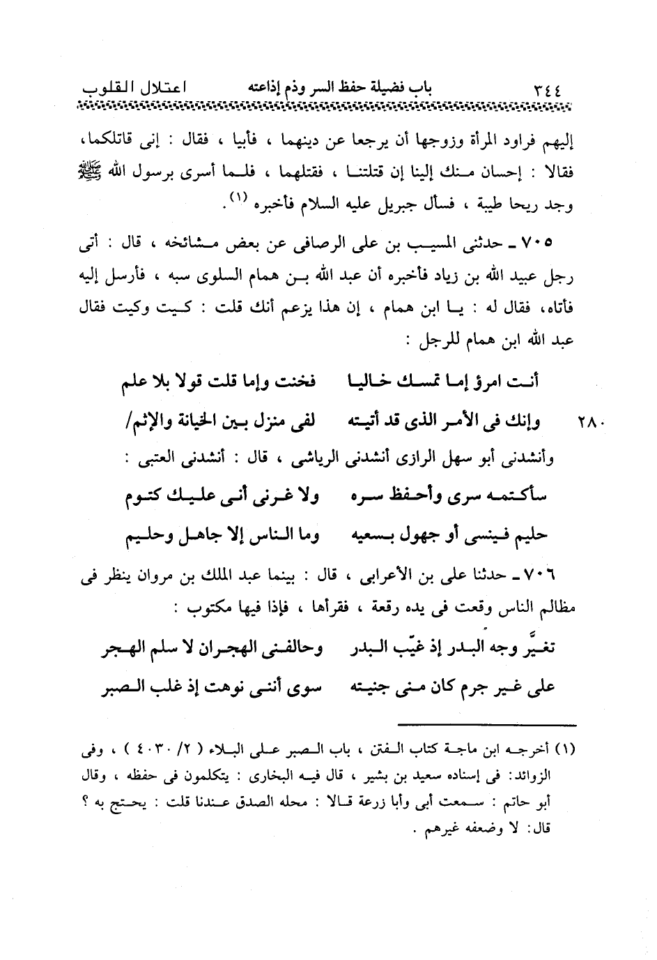 705 - حَدَّثَنِي الْمُسَيَّبُ بْنُ عَلِيٍّ الرُّصَافِيُّ , عَنْ بَعْضِ مَشَائِخِهِ قَالَ: أَتَى رَجُلٌ عُبَيْدَ اللَّهِ بْنَ زِيَادٍ فَأَخْبَرَهُ أَنَّ عَبْدَ اللَّهِ بْنَ هَمَّامٍ السَّلُولِيَّ سَبَّهُ , فَأَرْسَلَ إِلَيْهِ فَأَتَاهُ , فَقَالَ لَهُ: يَا ابْنَ هَمَّامٍ , إِنَّ هَذَا يَزْعُمُ أَنَّكَ قُلْتُ كَيْتَ وَكَيْتَ , فَقَالَ عَبْدُ اللَّهِ بْنُ هَمَّامٍ لِلرَّجُلِ: