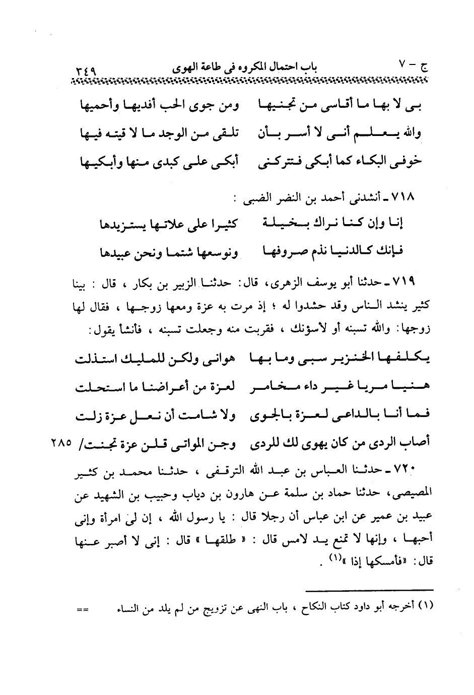 719 - حَدَّثَنَا أَبُو يُوسُفَ الزُّهْرِيُّ قَالَ: حَدَّثَنَا الزُّبَيْرُ بْنُ بَكَّارٍ قَالَ: بَيْنَا كُثَيِّرٌ يُنْشِدُ النَّاسَ وَقَدْ حَشَدُوا لَهُ , إِذْ مَرَّتْ بِهِ عَزَّةُ وَمَعَهَا زَوْجُهَا , فَقَالَ لَهَا زَوْجُهَا: وَاللَّهِ لَتَسُبِّنَّهُ أَوْ لَأَسُوءَنَّكِ , فَقَرُبَتْ مِنْهُ وَجَعَلَتْ تَسُبُّهُ , فَأَنْشَأَ يَقُولُ: