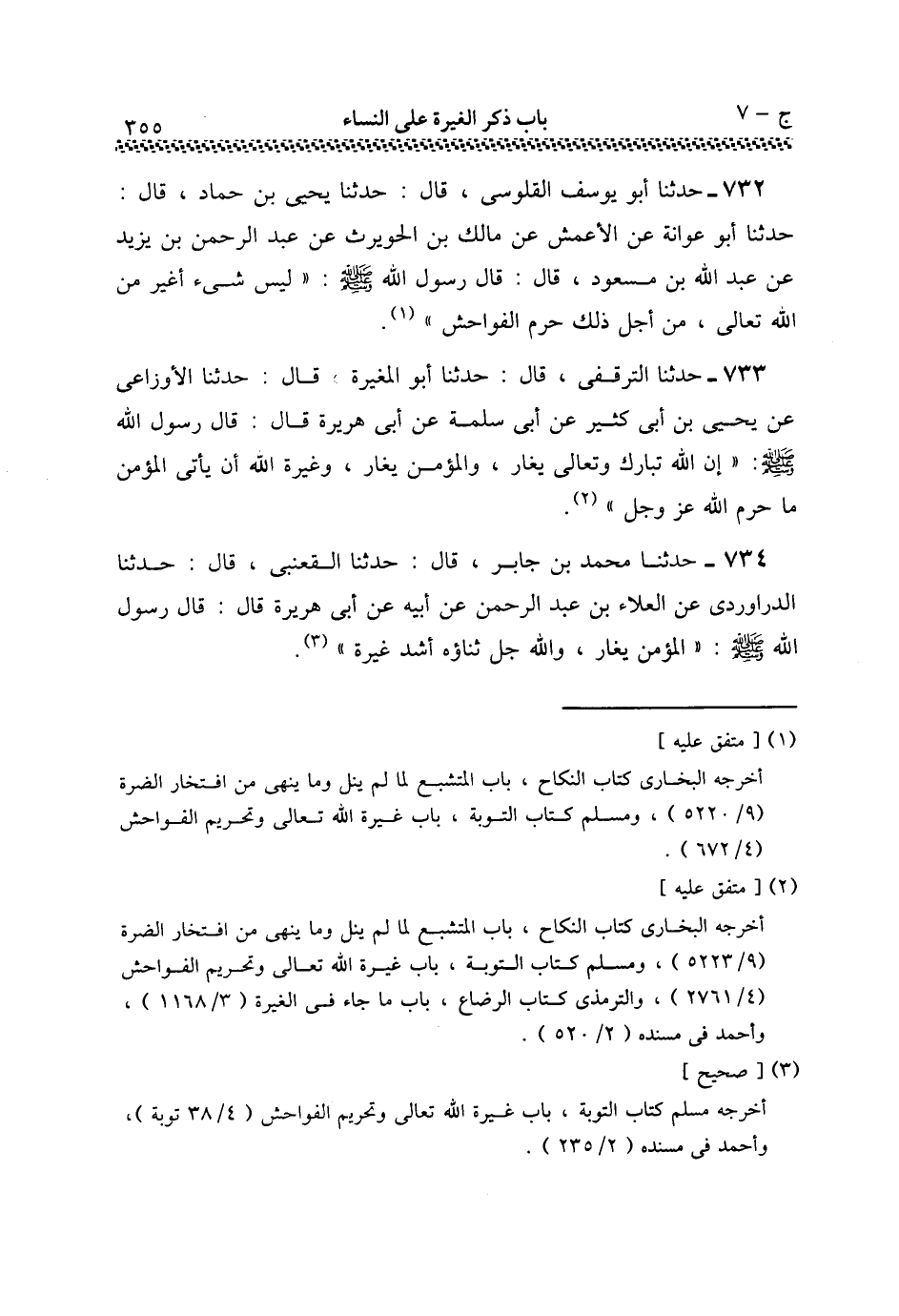 732 - حَدَّثَنَا أَبُو يُوسُفَ الْقَلُوسِيُّ قَالَ: حَدَّثَنَا يَحْيَى بْنُ حَمَّادٍ قَالَ: حَدَّثَنَا أَبُو عَوَانَةَ , عَنِ الْأَعْمَشِ , عَنْ مَالِكِ بْنِ الْحَارِثِ , عَنْ عَبْدِ الرَّحْمَنِ بْنِ يَزِيدَ , عَنْ عَبْدِ اللَّهِ بْنِ مَسْعُودٍ قَالَ: قَالَ رَسُولُ اللَّهِ صَلَّى اللهُ عَلَيْهِ وَسَلَّمَ «§لَيْسَ شَيْءٌ أَغْيَرُ مِنَ اللَّهِ تَعَالَى , مِنْ أَجْلِ ذَلِكَ حَرَّمَ الْفَوَاحِشَ»