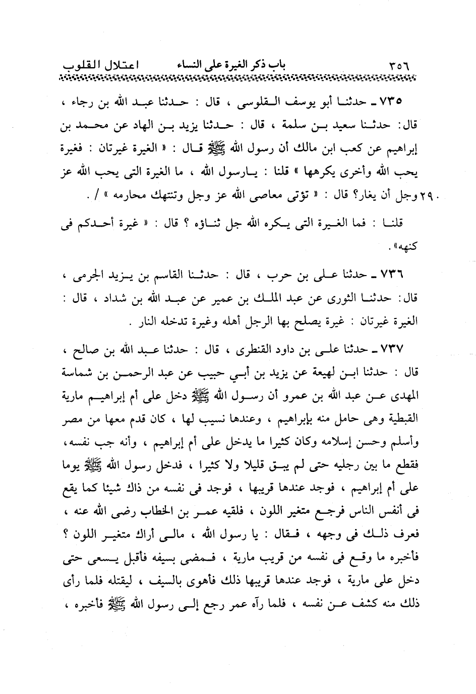 737 - حَدَّثَنَا عَلِيُّ بْنُ دَاوُدَ الْقَنْطَرِيُّ قَالَ: حَدَّثَنَا عَبْدُ اللَّهِ بْنُ صَالِحٍ قَالَ: حَدَّثَنَا ابْنُ لَهِيعَةَ , عَنْ يَزِيدَ بْنِ أَبِي حَبِيبٍ , عَنْ عَبْدِ الرَّحْمَنِ بْنِ شِمَاسَةَ الْمَهْدِيِّ , عَنْ عَبْدِ اللَّهِ بْنِ عَمْرٍو , أَنَّ رَسُولَ اللَّهِ صَلَّى اللهُ عَلَيْهِ وَسَلَّمَ دَخَلَ عَلَى أُمِّ إِبْرَاهِيمَ مَارِيَةَ الْقِبْطِيَّةِ وَهِيَ حَامِلٌ مِنْهُ بِإِبْرَاهِيمَ , وَعِنْدَهَا نَسِيبٌ لَهَا كَانَ قَدِمَ مَعَهَا مِنْ مِصْرَ وَأَسْلَمَ وَحَسُنَ إِسْلَامُهُ , وَكَانَ كَثِيرًا مَا يَدْخُلُ عَلَى أُمِّ إِبْرَاهِيمَ , وَأَنَّهُ جَبَّ نَفْسَهُ فَقَطَعَ مَا بَيْنَ رِجْلَيْهِ حَتَّى لَمْ يُبْقِ قَلِيلًا وَلَا كَثِيرًا , فَدَخَلَ رَسُولُ اللَّهِ صَلَّى اللهُ عَلَيْهِ وَسَلَّمَ يَوْمًا عَلَى أُمِّ إِبْرَاهِيمَ , فَوَجَدَ عِنْدَهَا قَرِيبُهَا , فَوَجَدَ فِي نَفْسِهِ مِنْ ذَاكَ شَيْئًا كَمَا يَقَعُ فِي أَنْفُسِ النَّاسِ , فَرَجَعَ مُتَغَيِّرَ اللَّوْنِ , فَلَقِيَهُ عُمَرُ بْنُ الْخَطَّابِ رَضِيَ اللَّهُ عَنْهُ , فَعَرَفَ ذَلِكَ فِي وَجْهِهِ , فَقَالَ: يَا رَسُولَ اللَّهِ , مَالِي أَرَاكَ مُتَغَيِّرَ اللَّوْنِ؟ فَأَخْبَرَهُ مَا وَقَعَ فِي نَفْسِهِ مِنْ قَرِيبِ مَارِيَةَ , فَمَضَى بِسَيْفِهِ فَأَقْبَلَ يَسْعَى حَتَّى دَخَلَ عَلَى مَارِيَةَ , فَوَجَدَ عِنْدَهَا قَرِيبَهَا ذَلِكَ , فَأَهْوَى بِالسَّيْفِ لِيَقْتُلَهُ , فَلَمَّا رَأَى ذَلِكَ مِنْهُ كَشَفَ عَنْ نَفْسِهِ , فَلَمَّا رَآهُ عُمَرُ رَجَعَ إِلَى رَسُولِ اللَّهِ صَلَّى اللهُ عَلَيْهِ وَسَلَّمَ فَأَخْبَرَهُ , -[357]- فَقَالَ: «§إِنَّ جِبْرِيلَ عَلَيْهِ السَّلَامُ أَتَانِي فَأَخْبَرَنِي أَنَّ اللَّهَ عَزَّ وَجَلَّ قَدْ بَرَّأَهَا وَقَرِيبَهَا مِمَّا وَقَعَ فِي نَفْسِي , وَبَشَّرَنِي أَنَّ فِيَ بَطْنِهَا غُلَامًا , وَأَنَّهُ أَشْبَهُ الْخَلْقِ بِي , وَأَمَرَنِي أَنْ أُسَمِّيَهُ إِبْرَاهِيمَ , وَكَنَّانِي بِأَبِي إِبْرَاهِيمَ , وَلَوْلَا أَنَّى أَكْرَهُ أَنْ أُحَوِّلَ كُنْيَتِي الَّتِي عُرِفْتُ بِهَا , لَاكْتَنَيْتُ بِأَبِي إِبْرَاهِيمَ , كَمَا كَنَّانِي جِبْرِيلُ عَلَيْهِ السَّلَامُ»