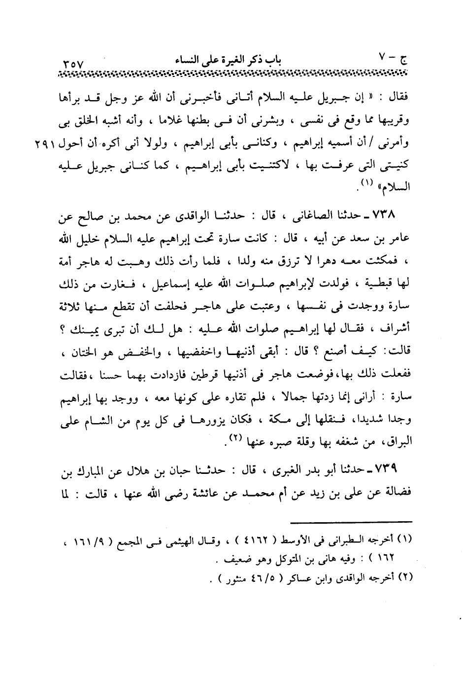 738 - حَدَّثَنَا الصَّاغَانِيُّ قَالَ: حَدَّثَنَا الْوَاقِدِيُّ , عَنْ مُحَمَّدِ بْنِ صَالِحٍ , عَنْ عَامِرِ بْنِ سَعْدٍ , عَنْ أَبِيهِ قَالَ: كَانَتْ سَارَةُ تَحْتَ إِبْرَاهِيمَ عَلَيْهِ السَّلَامُ خَلِيلِ اللَّهِ , فَمَكَثَتْ مَعَهُ دَهْرًا لَا تُرْزَقُ مِنْهُ وَلَدًا , فَلَمَّا رَأَتْ ذَلِكَ وَهَبَتْ لَهُ هَاجَرُ , أَمَةً لَهَا قِبْطِيَّةً , فَوَلَدَتْ لِإِبْرَاهِيمَ صَلَوَاتُ اللَّهِ عَلَيْهِ إِسْمَاعِيلَ , فَغَارَتْ مِنْ ذَلِكَ سَارَّةُ وَوَجَدَتْ فِي نَفْسِهَا , وَعَتَبَتْ عَلَى هَاجَرَ , فَحَلَفَتْ أَنْ تَقْطَعَ مِنْهَا ثَلَاثَةَ أَشْرَافٍ , فَقَالَ لَهَا إِبْرَاهِيمُ صَلَوَاتُ اللَّهِ عَلَيْهِ: " §هَلْ لَكِ أَنْ تَبَرِّي يَمِينَكِ؟ قَالَتْ: كَيْفَ أَصْنَعُ؟ قَالَ: أَبْقِي أُذُنَيْهَا وَاخْفِضِيهَا. وَالْخَفْضُ هُوَ الْخِتَانُ , فَفَعَلَتْ ذَلِكَ بِهَا , فَوَضَعْتُ هَاجَرُ فِي أُذُنَيْهَا قُرْطَيْنِ فَازْدَادَتْ بِهِمَا حُسْنًا , فَقَالَتْ سَارَةُ: أُرَانِي إِنَّمَا زِدْتُهَا جَمَالًا , فَلَمْ تُقَارِّهِ عَلَى كَوْنِهَا مَعَهُ , وَوَجَدَ بِهَا إِبْرَاهِيمُ وَجْدًا شَدِيدًا , فَنَقَلَهَا إِلَى مَكَّةَ , فَكَانَ يَزُورُهَا فِي كُلِّ يَوْمٍ مِنَ الشَّامِ عَلَى الْبُرَاقِ مِنْ شَغَفِهِ بِهَا , وَقِلَّةِ صَبْرِهِ عَنْهَا "