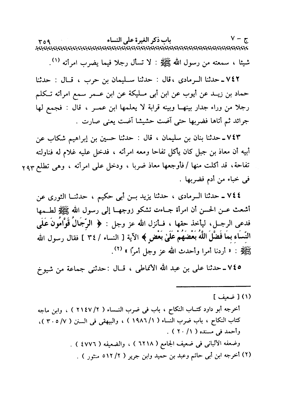 744 - حَدَّثَنَا الرَّمَادِيُّ , حَدَّثَنَا يَزِيدُ بْنُ أَبِي حَكِيمٍ , حَدَّثَنَا الثَّوْرِيُّ , عَنْ أَشْعَثَ , عَنِ الْحَسَنِ , أَنَّ امْرَأَةً , جَاءَتْ تَشْكُو زَوْجَهَا إِلَى رَسُولِ اللَّهِ صَلَّى اللهُ عَلَيْهِ وَسَلَّمَ لَطَمَهَا , فَدَعَى الرَّجُلَ لِيَأْخُذَ حَقَّهَا , فَأَنْزَلَ اللَّهُ عَزَّ وَجَلَّ: {الرِّجَالُ قَوَّامُونَ عَلَى النِّسَاءِ بِمَا فَضَّلَ اللَّهُ بَعْضَهُمْ عَلَى بَعْضٍ} [النساء: 34] الْآيَةَ , فَقَالَ رَسُولُ اللَّهِ صَلَّى اللهُ عَلَيْهِ وَسَلَّمَ: «§أَرَدْنَا أَمْرًا وَأَحْدَثَ اللَّهُ عَزَّ وَجَلَّ أَمْرًا»