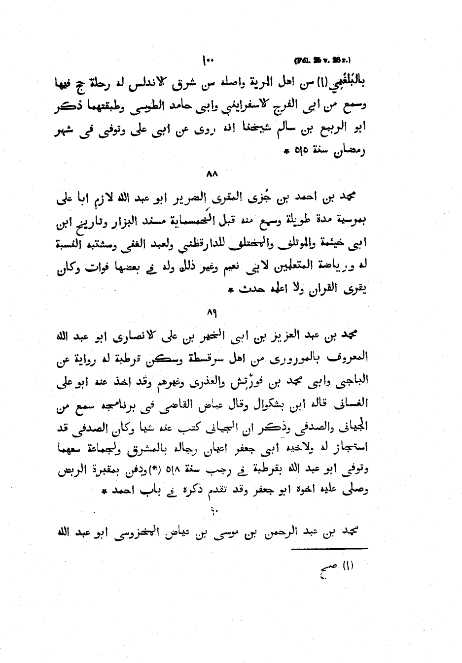 بِالْبَلِغِييِّ مِنْ أَهْلِ الْمَرِيَّةِ وَأَصْلُهُ مِنْ شَرْقِ الأَنْدَلُسِ لَهُ رِحْلَةٌ حَجَّ فِيهَا وَسَمِعَ مِنْ أَبِي الْفَرَجِ الإِسْفَرَاينِيِّ وَأَبِي حَامِدٍ الطُّوسِيِّ وَطَبَقَتِهِمَا ذَكَرَ أَبُو الرَّبِيعِ بْنُ سَالِمٍ شَيْخُنَا أَنَّهُ رَوَى عَنْ أَبِي عَلِيٍّ وَتُوُفِّيَ فِي شَهْرِ رَمَضَانَ سَنَةَ 515 مُحَمَّدُ بْنُ أَحْمَدَ بْنِ جُزِيٍّ المقري الضَّرِيرُ أَبُو عَبْدِ اللَّهِ لَازَمَ أَبَا عَلِيٍّ بمرسية مدة طويلة وسمع منه قبل الخمسماية مسند البزار وتاريخ ابن أبي خيثمة والموتلف وَالْمُخْتَلِفَ لِلدَّارَقُطْنِيِّ وَلِعَبْدِ الْغَنِيِّ وَمُشْتَبِهَ النِّسْبَةِ لَهُ وَرِيَاضَةَ الْمُتَعَلِّمِينَ لأَبِي نُعَيْمٍ وَغَيْرَ ذَلِكَ وَلَهُ في بعضها فوات وكان يقرى الْقُرْآنَ وَلا أَعْلَمُهُ حَدَّثَ مُحَمَّدُ بْنُ عَبْدِ الْعَزِيزِ بْنِ أَبِي الْخَيْرِ بْنِ عَلِيٍّ الأَنْصَارِيُّ أَبُو عَبْدِ اللَّهِ الْمَعْرُوفُ بِالْمَوْرُورِيِّ مِنْ أَهْلِ سَرَقُسْطَةَ وَسَكَنَ قُرْطُبَةَ لَهُ رِوَايَةٌ عَنِ الْبَاجِيِّ وأبي محمد بْنِ فُورْتِشَ وَالْعُذْرِيِّ وَغَيْرِهِمْ وَقَدْ أَخَذَ عَنْهُ أَبُو عَلِيٍّ الْغَسَّانِيُّ قَالَهُ ابْنُ بَشْكُوَالَ وَقَالَ عِيَاضٌ الْقَاضِي فِي بِرْنَامَجِهِ سَمِعَ مِنَ الْجَيَّانِيِّ والصدفي وذكر أن الجياني كتب عنه شيا وَكَانَ الصَّدَفِيُّ قَدِ اسْتَجَازَ لَهُ وَلأَخِيهِ أَبِي جَعْفَرٍ أَعْيَانَ رِجَالِهِ بِالْمَشْرِقِ وَلِجَمَاعَةٍ مَعَهُمَا وَتُوُفِّيَ أَبُو عَبْدِ اللَّهِ بِقُرْطُبَةَ فِي رَجَبٍ سَنَةَ 518 وَدُفِنَ بِمَقْبَرَةِ الرِّبَضِ وَصَلَّى عَلَيْهِ أَخُوهُ أَبُو جَعْفَرٍ وَقَدْ تَقَدَّمَ ذِكْرُهُ فِي بَابِ أَحْمَدٍ مُحَمَّدُ بْنُ عَبْدِ الرَّحْمَنِ بْنِ مُوسَى بْنِ عِيَاضٍ الْمَخْزُومِيُّ أَبُو عَبْدِ اللَّهِ