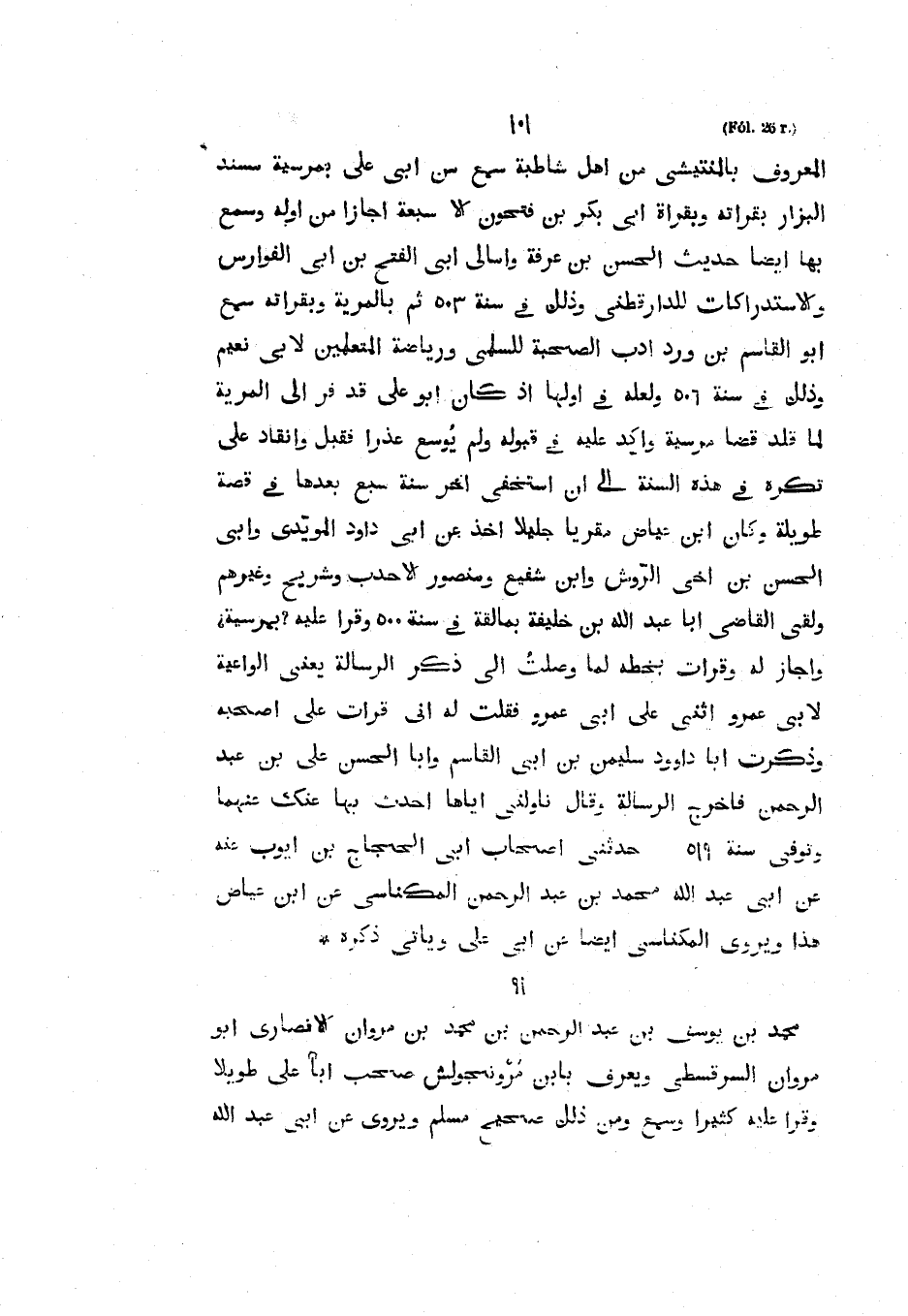 الْمَعْرُوفُ بِالْمَنْتِيشِيِّ مِنْ أَهْلِ شَاطِبَةَ سَمِعَ مِنْ أبي علي بمرسية مسند البزار بقراته وبقراة أبي بكر بن فتحون إلا سبعة أجازا مِنْ أَوَّلِهِ وَسَمِعَ بِهَا أَيْضًا حَدِيثَ الْحَسَنِ بْنِ عَرَفَةَ وَأَمَالِيَ أَبِي الْفَتْحِ بْنِ أَبِي الْفَوَارِسِ وَالاسْتِدْرَاكَاتِ لِلدَّارَقُطْنِيِّ وَذَلِكَ فِي سَنَةِ 503 ثُمَّ بالمرية وبقراته سَمِعَ أَبُو الْقَاسِمِ بْنُ وَرْدٍ أَدَبَ الصُّحْبَةِ لِلسُّلَمِيِّ وَرِيَاضَةَ الْمُتَعَلِّمِينَ لأَبِي نُعَيْمٍ وَذَلِكَ فِي سَنَةِ 506 وَلَعَلَّهُ فِي أَوَّلِهَا إِذْ كَانَ أَبُو عَلِيٍّ قَدْ فَرَّ إِلَى الْمَرِيَّةِ لَمَّا قُلِّدَ قضا مُرْسِيَّةَ وَأُكِّدَ عَلَيْهِ فِي قَبُولِهِ وَلَمْ يُوسَعْ عُذْرًا فَقَبِلَ وَانْقَادَ عَلَى تَكَرُّهٍ فِي هَذِهِ السنة إلى أن استخفى آخِرِ سَنَةِ سَبْعٍ بَعْدَهَا فِي قِصَّةٍ طَوِيلَةٍ وكان ابن عياض مقرياً جليلاً أخذ عن أبي داود المويّدي وَأَبِي الْحَسَنِ بْنِ أَخِي الرَّوَشِ وَابْنِ شَفِيعٍ وَمَنْصُورٍ الأَحْدَبِ وَشُرَيْحٍ وَغَيْرِهِمْ وَلَقِيَ الْقَاضِيَ أَبَا عَبْدِ اللَّهِ بْنَ خَلِيفَةَ بِمَالِقَةَ فِي سَنَةِ 500 وَقَرَأَ عَلَيْهِ بِمُرْسِيَّةَ وَأَجَازَ لَهُ وَقَرَأْتُ بِخَطِّهِ لَمَّا وَصَلْتُ إِلَى ذِكْرِ الرِّسَالَةِ يَعْنِي الْوَاعِيَةَ لأبي عمرو اثني على أبي عمرو فقلت له إني قرأت على أصحبه وذكرت أبا داوود سُلَيْمَانَ بْنَ أَبِي الْقَاسِمِ وَأَبَا الْحَسَنِ عَلِيَّ بْنَ عَبْدِ الرَّحْمَنِ فَأَخْرَجَ الرِّسَالَةَ وَقَالَ نَاوِلْنِي إِيَّاهَا أُحَدِّثُ بِهَا عَنْكَ عَنْهُمَا وَتُوُفِّيَ سَنَةَ 519 حَدَّثَنِي أَصْحَابُ أَبِي الْحَجَّاجِ بْنِ أَيُّوبَ عَنْهُ عَنْ أَبِي عَبْدِ اللَّهِ مُحَمَّدِ بْنِ عَبْدِ الرَّحْمَنِ الْمِكْنَاسِيِّ عَنِ ابْنِ عِيَاضٍ هَذَا وَيَرْوِي الْمِكْنَاسِيُّ أَيْضًا عَنْ أَبِي عَلِيٍّ وَيَأْتِي ذِكْرُهُ