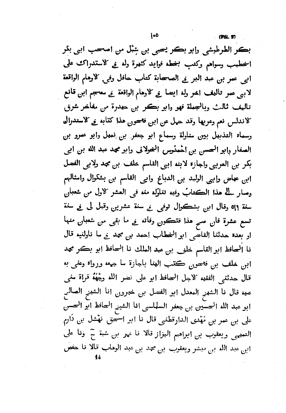 بَكْرٍ الطُّرْطُوشِيُّ وَأَبُو بَكْرٍ يَحْيَى بْنُ شِبْلٍ من أصحب أبي بكر الخطيب وسواهم وكتب بخطه فوايد كثيرة وله الاسْتِدْرَاكِ عَلَى أَبِي عُمَرَ بْنِ عَبْدِ الْبَرِّ فِي الصَّحَابَةِ كِتَابٌ حَافِلٌ وَفِي الأَوْهَامِ الْوَاقِعَةِ لأَبِي عُمَرَ تَأْلِيفٌ آخَرُ وَلَهُ أَيْضًا فِي الأَوْهَامِ الْوَاقِعَةِ فِي مُعْجَمِ ابْنِ قَانِعٍ تَأْلِيفٌ ثَالِثٌ وَبِالْجُمْلَةِ فَهُوَ وَأَبُو بَكْرِ بْنُ حَيْدَرَةَ مِنْ مَفَاخِرِ شَرْقِ الأَنْدَلُسِ نَعَمْ وَعَرَبِهَا وَقَدْ حَمَلَ عَنِ ابْنِ فَتْحُونٍ هَذَا كِتَابَهُ فِي الاستدراك وسماه التذبيل بين مناولة وسماع أبو جَعْفَرِ بْنِ نُمِيلَ وَأَبُو عَمْرِو بْنُ الصَّفَّارِ وَأَبُو الْحَسَنِ بْنُ أَحْمَدُوسَ الْخَوْلانِيُّ وَأَبُو مُحَمَّدٍ عَبْدُ اللَّهِ بْنُ أَبِي بَكْرِ بْنِ الْعَرَبِيِّ وَأَجَازَهُ لابْنِهِ أَبِي الْقَاسِمِ خَلَفِ بْنِ مُحَمَّدٍ ولأبي الفضل ابن عِيَاضٍ وَأَبِي الْوَلِيدِ بْنِ الدَّبَّاغِ وَأَبِي الْقَاسِمِ بْنِ بَشْكُوَالَ وَأَمْثَالِهِمْ وَصَارَ إِلَى هَذَا الْكِتَابِ وفيه تناوله منه في الشعر الأُوَلِ مِنْ شَعْبَانَ سَنَةَ 519 وَقَالَ ابْنُ بَشْكُوَالَ توفي في سَنَةَ عِشْرِينَ وَقِيلَ لِي فِي سَنَةِ تِسْعَ عشرة فغن صَحَّ هَذَا فَتَكُونَ وَفَاتُهُ فِي مَا بَقِيَ مِنْ شَعْبَانَ مِنْهَا أَوْ بَعْدَهُ حَدَّثَنَا الْقَاضِي أبو الخطاب أحمد بن محمد في ما نَاوَلَنِيهِ قَالَ نَا الْحَافِظُ أَبُو الْقَاسِمِ خَلَفُ بْنُ عَبْدِ الْمَلِكِ نَا الْحَافِظُ أَبُو بَكْرٍ محمد ابن خَلَفِ بْنِ فَتْحُونٍ كَتَبَ إِلَيْنَا بِإِجَازَةٍ مَا جَمَعَهُ وَرَوَاهُ وَعُنِيَ بِهِ قَالَ حَدَّثَنِي الْفَقِيهُ الأَجَلُّ الْحَافِظُ أَبُو عَلِيٍّ نَضَّرَ اللَّهُ وَجْهَهُ قراة مِنِّي عَلَيْهِ قَالَ نَا الشَّيْخُ الْمُعَدَّلُ أَبُو الْفَضْلِ بْنُ خَيْرُونَ أَنَا الشَّيْخُ الصَّالِحُ أَبُو عَبْدِ اللَّهِ الْحُسَيْنُ بْنُ جَعْفَرٍ السَّلَمَاسِيُّ أَنَا الشَّيْخُ الْحَافِظُ أَبُو الْحَسَنِ عَلِيُّ بْنُ عُمَرَ بن مهدي الدارقطني قال نا أبو اسحق نَهْشَلُ بْنُ دَارِمٍ التَّمِيمِيُّ وَيَعْقُوبُ بْنُ إِبْرَاهِيمَ البزار قَالا نَا عُمَرُ بْنُ شَبَّةَ ح وَنَا علي ابن عَبْدِ اللَّهِ بْنِ مُبَشِّرٍ وَيَعْقُوبُ بْنُ مُحَمَّدِ بن عبد الوهاب قالا نا حفص