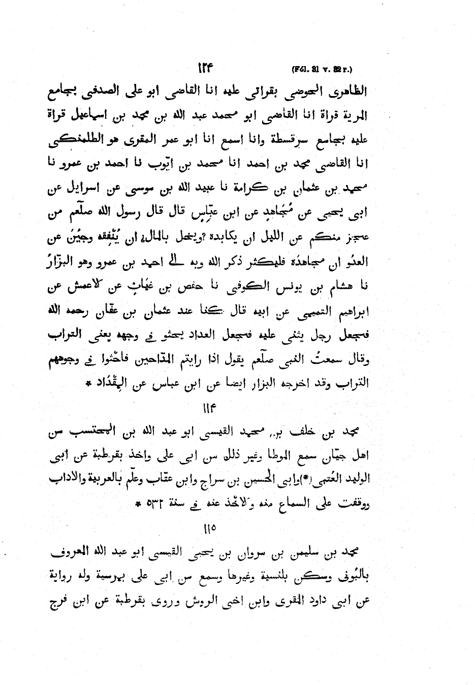 الظاهري الحوضي بقراتي عَلَيْهِ أَنَا الْقَاضِي أَبُو عَلِيٍّ الصَّدَفِيُّ بِجَامِعِ المرية قراة أَنَا الْقَاضِي أَبُو مُحَمَّدٍ عَبْدُ اللَّهِ بْنُ محمد بن إسماعيل قراة عليه بجامع سرقسطة وأنا أسمع أنا أبو عمر المقري هُوَ الطَّلَمَنْكِيُّ أَنَا الْقَاضِي مُحَمَّدُ بْنُ أَحْمَدَ أنا مُحَمَّدُ بْنُ أَيُّوبَ نا أَحْمَدُ بْنُ عَمْرٍو نا مُحَمَّدُ بْنُ عُثْمَانَ بْنِ كَرَامَةَ نا عبيد الله بن موسى عن اسرايل عَنْ أَبِي يَحْيَى عَنْ مُجَاهِدٍ عَنِ ابْنِ عَبَّاسٍ قَالَ قَالَ رَسُولُ اللَّهِ صَلَّى اللَّهُ عَلَيْهِ وَسَلَّمَ مِنْ عَجَزَ مِنْكُمْ عَنِ اللَّيْلِ أن يكابده ويخل بالمال أن ينفقه وجين عن العدوان مجاهدة فَلْيُكْثِرْ ذِكْرَ اللَّهِ وَبِهِ إِلَى أَحْمَدَ بْنِ عَمْرٍو وَهُوَ الْبَزَّارُ نا هِشَامُ بْنُ يُونُسَ الْكُوفِيُّ نا حَفْصُ بْنُ غِيَاثٍ عَنِ الأَعْمَشِ عَنْ إِبْرَاهِيمَ التَّمِيمِيِّ عَنْ أَبِيهِ قَالَ كُنَّا عِنْدَ عُثْمَانَ بْنِ عَفَّانَ رَحِمَهُ اللَّهُ فَجَعَلَ رجل يثني عليه فجعل العداد يَحْثُو فِي وَجْهِهِ يَعْنِي التُّرَابَ وَقَالَ سَمِعْتُ النَّبِيَّ صَلَّى اللَّهُ عَلَيْهِ وَسَلَّمَ يَقُولُ إِذَا رأيتم المداحين فاحثوا في وجوهم التُّرَابَ وَقَدْ أَخْرَجَهُ الْبَزَّارُ أَيْضًا عَنِ ابْنِ عَبَّاسٍ عَنِ الْمِقْدَادِ