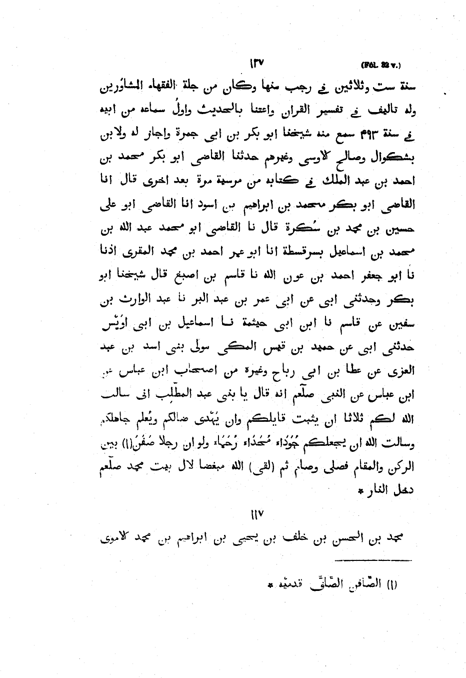 سَنَةَ سِتٍّ وَثَلاثِينَ فِي رَجَبٍ مِنْهَا وَكَانَ مِنْ جِلَّةِ الْفُقَهَاءِ الْمُشَاوَرَيْنِ وَلَهُ تَآلِيفُ فِي تفسير القرآن واعتنا بِالْحَدِيثِ وَأَوَّلُ سَمَاعِهِ مِنْ أَبِيهِ فِي سَنَةِ 493 سَمِعَ مِنْهُ شَيْخُنَا أَبُو بَكْرِ بْنُ أَبِي جَمْرَةَ وَأَجَازَ لَهُ وَلابْنِ بَشْكُوَالَ وَصَالِحٍ الأَوْسِيِّ وَغَيْرِهِمْ حَدَّثَنَا الْقَاضِي أَبُو بَكْرٍ مُحَمَّدُ بْنُ أَحْمَدَ بْنِ عَبْدِ الْمَلِكِ فِي كِتَابِهِ مِنْ مُرْسِيَّةَ مَرَّةً بَعْدَ أُخْرَى قَالَ أَنَا الْقَاضِي أَبُو بَكْرٍ مُحَمَّدُ بْنُ إِبْرَاهِيمَ بْنِ أَسْوَدَ أَنَا الْقَاضِي أَبُو عَلِيٍّ حُسَيْنُ بْنُ مُحَمَّدِ بن سكرة قال نا الْقَاضِي أَبُو مُحَمَّدٍ عَبْدُ اللَّهِ بْنُ مُحَمَّدِ بْنِ إِسْمَاعِيلَ بِسَرَقُسْطَةَ أَنَا أَبُو عُمَرَ أَحْمَدُ بن محمد المقري إِذْنًا نا أَبُو جَعْفَرٍ أَحْمَدُ بْنُ عَوْنِ اللَّهِ نا قَاسِمُ بْنُ أَصْبَغَ قَالَ شَيْخُنَا أَبُو بَكْرٍ وَحَدَّثَنِي أَبِي عَنْ أَبِي عُمَرَ بْنِ عَبْدِ الْبَرِّ نا عَبْدُ الْوَارِثِ بْنُ سفين عن قاسم نا ابن أبي حيثمة نا إِسْمَاعِيلُ بْنُ أَبِي أُوَيْسٍ حدَّثَنِي أَبِي عَنْ حُمَيْدِ بْنِ قَيْسٍ الْمَكِّيِّ مَوْلَى بَنِي أسد بن عبد العزي عن عطا بْنِ أَبِي رَبَاحٍ وَغَيْرِهِ مِنْ أَصْحَابِ ابْنِ عَبَّاسٍ عَنِ ابْنِ عَبَّاسٍ عَنِ النَّبِيِّ صَلَّى اللَّهُ عَلَيْهِ وَسَلَّمَ أَنَّهُ قَالَ يَا بَنِي عَبْدِ الْمُطَّلِبِ إِنِّي سَأَلْتُ اللَّهَ لَكُمْ ثَلاثًا أن يثبت قايلكم وَأَنْ يَهْدِيَ ضَالَّكُمْ وَيُعَلِّمَ جَاهِلَكُمْ وَسَأَلْتُ اللَّهَ أَنْ يَجْعَلَكُمْ جُودَاءَ مُحَدَاءَ رُحَمَاءَ وَلَوْ أَنَّ رَجُلا صَفَنَ بَيْنَ الرُّكْنِ وَالْمَقَامِ فَصَلَّى وَصَامَ ثُمَّ " لَقِيَ " اللَّهَ مُبْغِضًا لآلِ بَيْتِ مُحَمَّدٍ صَلَّى اللَّهُ عَلَيْهِ وَسَلَّمَ دَخَلَ النَّارَ