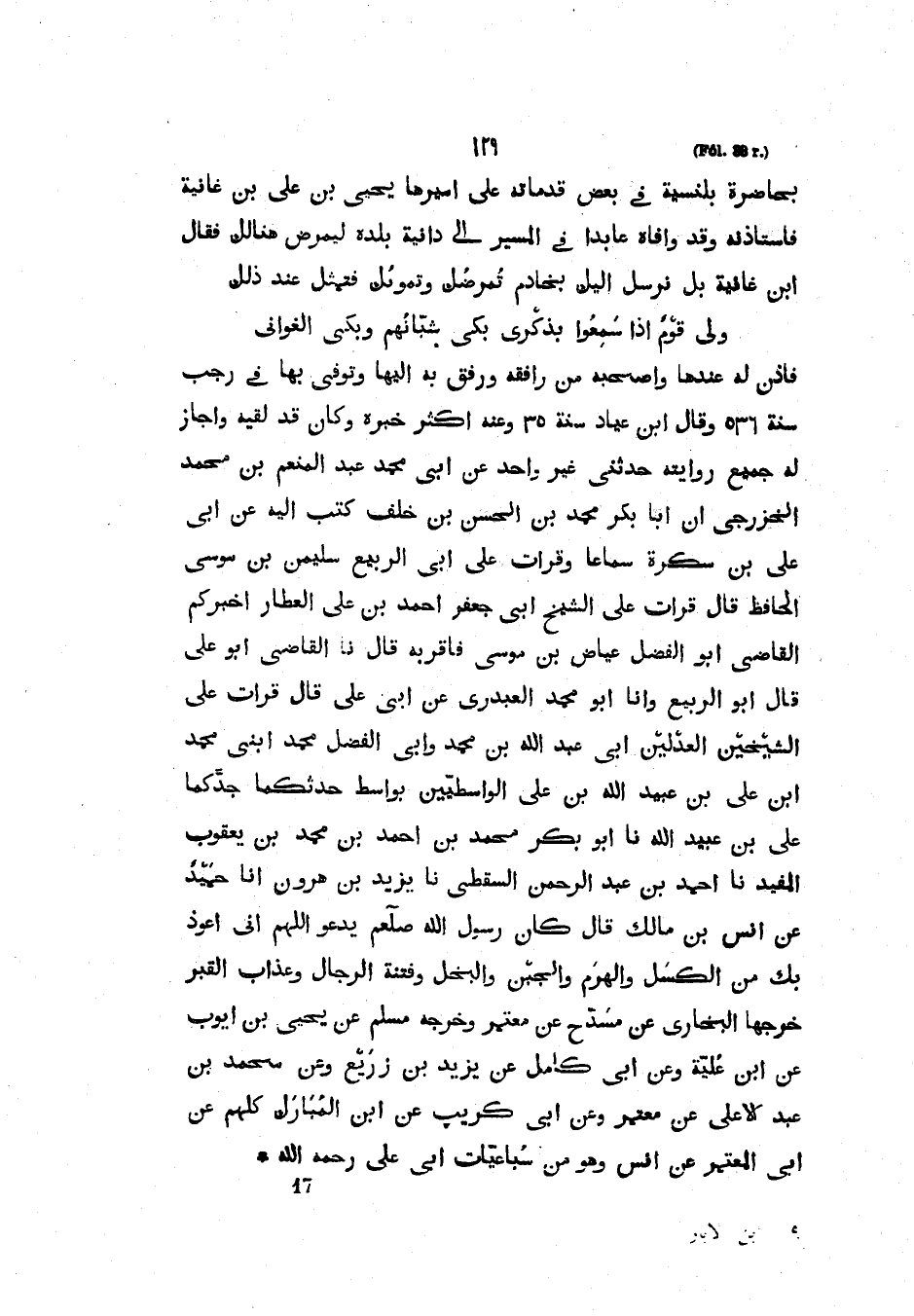 فَأَذِنَ لَهُ عندها وأصحبه مَنْ رَافَقَهُ وَرُفِقَ بِهِ إِلَيْهَا وَتُوُفِّيَ بِهَا فِي رَجَبٍ سَنَةَ 536 وَقَالَ ابْنُ عَيَّادٍ سَنَةَ 35 وَعَنْهُ أَكْثَرُ خَبَرِهِ وَكَانَ قَدْ لَقِيَهُ وَأَجَازَ لَهُ جَمِيعَ رِوَايَتِهِ حَدَّثَنِي غَيْرُ وَاحِدٍ عَنْ أَبِي مُحَمَّدٍ عَبْدِ الْمُنْعِمِ بْنِ مُحَمَّدٍ الْخَزْرَجِيِّ أَنَّ أَبَا بَكْرٍ مُحَمَّدَ بْنَ الْحَسَنِ بْنِ خَلَفٍ كَتَبَ إِلَيْهِ عَنْ أَبِي عَلِيِّ بْنِ سُكَّرَةَ سَمَاعًا وَقَرَأْتُ عَلَى أَبِي الرَّبِيعِ سُلَيْمَانَ بْنِ مُوسَى الْحَافِظِ قَالَ قَرَأْتُ عَلَى الشَّيْخِ أَبِي جَعْفَرٍ أَحْمَدَ بْنِ عَلِيٍّ الْعَطَّارِ أَخْبَرَكُمُ القاضي أبو الفضل عياض بن موسى فأقربه قَالَ نا الْقَاضِي أَبُو عَلِيٍّ قَالَ أَبُو الرَّبِيعِ وأنا أَبُو مُحَمَّدٍ الْعَبْدَرِيُّ عَنْ أَبِي عَلِيٍّ قَالَ قَرَأْتُ عَلَى الشَّيْخَيْنِ الْعَدْلَيْنِ أَبِي عَبْدِ اللَّهِ بْنِ مُحَمَّدٍ وَأَبِي الْفَضْلِ مُحَمَّدٍ أبي محمد ابن عَلِيِّ بْنِ عُبَيْدِ اللَّهِ بْنِ عَلِيٍّ الْوَاسِطِيَّيْنِ بِوَاسِطٍ حَدَّثَكُمَا جَدُّكُمَا عَلِيُّ بْنُ عُبَيْدِ اللَّهِ نا أَبُو بَكْرٍ مُحَمَّدُ بْنُ أَحْمَدَ بْنِ مُحَمَّدِ بْنِ يَعْقُوبَ الْمُفِيدُ نا أَحْمَدُ بْنُ عبد الرحمن السقطي نا يزيد بن هرون أَنَا حُمَيْدٌ عَنْ أَنَسِ بْنِ مَالِكٍ قَالَ كَانَ رَسُولُ اللَّهِ صَلَّى اللَّهُ عَلَيْهِ وَسَلَّمَ يَدْعُو اللَّهُمَّ إِنِّي أَعُوذُ بِكَ مِنَ الْكَسَلِ وَالْهَرَمِ وَالْجُبْنِ وَالْبُخْلِ وَفِتْنَةِ الرِّجَالِ وَعَذَابِ الْقَبْرِ خرجها البخاري عن مسدح عَنْ مُعْتَمِرٍ وَخَرَّجَهُ مُسْلِمٌ عَنْ يَحْيَى بْنِ أَيُّوبَ عَنِ ابْنِ عُلَيَّةَ وَعَنْ أَبِي كَامِلٍ عَنْ يَزِيدَ بْنِ زُرَيْعٍ وَعَنْ مُحَمَّدِ بْنِ عَبْدِ الأَعْلَى عَنْ مُعْتَمِرٍ وَعَنْ أَبِي كُرَيْبٍ عَنِ ابْنِ الْمُبَارَكِ كُلُّهُمْ عَنْ أَبِي الْمُعْتَمِرِ عَنْ أَنَسٍ وَهُوَ مِنْ سُبَاعِيَّاتِ أَبِي عَلِيٍّ رحمه الله