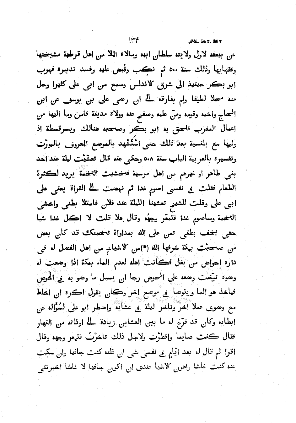 عَنْ بَيْعَتِهِ لأَوَّلِ وِلايَتِهِ سُلْطَانَ أَبِيهِ وَمَالأهُ الملا من أهل قرطبة مشيختها وفقهايها وَذَلِكَ سَنَةَ 500 ثُمَّ نُكِبَ وَقُبِضَ عَلَيْهِ وَفَسَدَ تدبيره فهرب أبو بكر حينيذ إِلَى شَرْق الأَنْدَلُسِ وَسَمِعَ مِنْ أَبِي عَلِيٍّ كَثِيرًا وَحَلَّ مِنْهُ مَحَلا لَطِيفًا وَلَمْ يُفَارِقْهُ إلى أن رضى علي بن يُوسُفَ عَنِ ابْنِ الْحَاجِّ وَأَخِيهِ وَقَوْمِهِ وَمَنَّ عَلَيْهِ وَصَفَحَ عَنْهُ وَوَلاهُ مَدِينَةَ فَاسَ وَمَا إِلَيْهَا مِنْ أَعْمَالِ الْمَغْرِبِ فَلَحِقَ بِهِ أَبُو بَكْرٍ وَصَحِبَهُ هُنَالِكَ وَبِسَرَقُسْطَةَ إِذْ وَلِيَهَا مَعَ بَلَنْسِيَةَ بَعْدَ ذَلِكَ حَتَّى اسْتُشْهِدَ بِالْمَوْضِعِ الْمَعْرُوفِ بِالْبورْتِ وَتَفْسِيرُهُ بِالْعَرَبِيَّةِ الْبَابُ سَنَةَ 508 وَحَكَى عَنْهُ قَالَ تَعَشَّيْتُ لَيْلَةً عِنْدَ أَحَدِ بَنِي طَاهِرٍ أَوْ غَيْرِهِمْ مِنْ أَهْلِ مُرْسِيَّةَ فَخَشِيتُ التُّخَمَةَ يُرِيدُ لِكَثْرَةِ الطَّعَامِ فَقُلْتُ فِي نَفْسِي أَصُومُ غدا ثم نهضت إلى القراة يَعْنِي عَلَى أَبِي عَلِيٍّ وَقُلْتُ لِلشَّيْخِ تَعَشَّيْنَا اللَّيْلَةَ عِنْدَ فُلانٍ فَامْتَلأَ بَطْنِي وَأَخْشَى التُّخَمَةَ وسأصوم غدا فتعمر وجهه وقال هلا لا أكل غدا شيا حَتَّى يَخِفَّ بَطْنِي تَمُنُّ عَلَى اللَّهِ بِمُدَاوَاةِ تُخَمَتِكَ قَدْ كَانَ بَعْضُ مَنْ صَحِبْتَ بِمَكَّةَ شَرَّفَهَا اللَّهُ مِنَ الأَشْيَاخِ مِنْ أَهْلِ الْفَضْلِ لَهُ فِي دَارِهِ أَحْوَاضٌ مِنْ بغلٍ فَكَانَتْ أهله لعدم الماء بمكة إذا رضعت له وضوه توخت وضعه على الحوض رجا أن يسيل ما وضو به في الحوض فيأخذ هو الما وَيَتَوَضَّأُ فِي مَوْضِعٍ آخَرَ وَكَانَ يَقُولُ أَكْرَهُ أن أخلط مع وضوي عملاً آخر وتأخر ليلة في عشايه واضطر أبو علي لسواله عن أبطايه وكان قد فرغ له ما بين العشاين زِيَادَةً إِلَى أَوْقَاتِهِ مِنَ النَّهَارِ فَقَالَ كُنْتُ صايماً وأفطرت ولأجل ذلك تأخرت فتعمر وَجْهُهُ وَقَالَ اقْرَأْ ثُمَّ قَالَ لَهُ بَعْدَ أَيَّامٍ فِي نَفْسِي شَيْءٌ إِنْ قُلْتُهُ كُنْتُ جَافِيًا وَإِنْ سَكَتُّ عَنْهُ كُنْتُ غَاشًّا وَأَهْوَنُ الأشيا عِنْدِي أَنْ أَكُونَ جَافِيًا لا غَاشًّا أَخْبَرْتَنِي