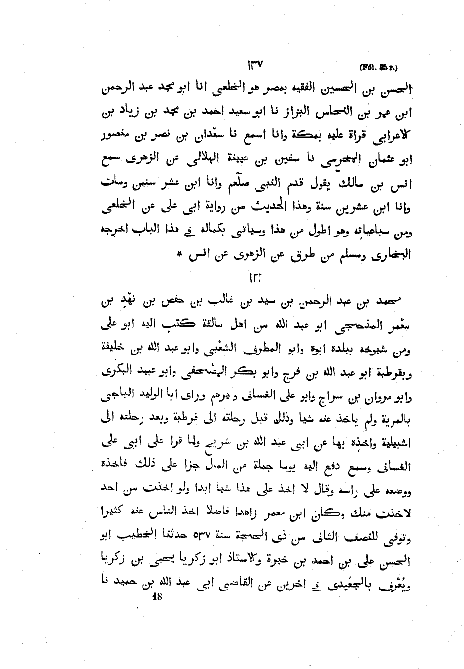 الْحَسَنِ بْنِ الْحُسَيْنِ الْفَقِيهُ بِمِصْرَ هُوَ الْخِلَعِيُّ أنا أبو محمد عبد الرحمن ابن عمر بن النحاس البزار نا أَبُو سَعِيدٍ أَحْمَدُ بْنُ مُحَمَّدِ بْنِ زياد بن الأعرابي قراة عَلَيْهِ بِمَكَّةَ وَأَنَا أَسْمَعُ نا سَعْدَانُ بْنُ نَصْرِ بْنِ مَنْصُورٍ أَبُو عُثْمَانَ الْمُخَرِّمِيُّ نا سفين بْنُ عُيَيْنَةَ الْهِلالِيُّ عَنِ الزُّهْرِيِّ سَمِعَ أَنَسَ بْنَ مَالِكٍ يَقُولُ قَدِمَ النَّبِيُّ صَلَّى اللَّهُ عَلَيْهِ وَسَلَّمَ وَأَنَا ابْنُ عَشْرِ سِنِينَ وَمَاتَ وَأَنَا ابْنُ عِشْرِينَ سَنَةً وَهَذَا الْحَدِيثُ مِنْ رِوَايَةِ أَبِي عَلِيٍّ عَنِ الْخِلَعِيِّ وَمِنْ سُبَاعِيَّاتِهِ وَهُوَ أَطْوَلُ مِنْ هَذَا وَسَيَأْتِي بِكَمَالِهِ فِي هَذَا الْبَابِ أَخْرَجَهُ الْبُخَارِيُّ وَمُسْلِمٌ مِنْ طُرُقٍ عَنِ الزُّهْرِيِّ عَنْ أَنَسٍ.
