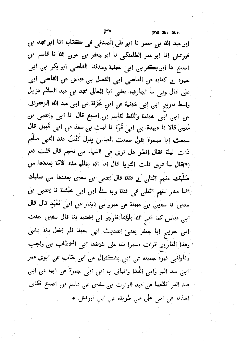 أَبُو عَبْدِ اللَّهِ بْنُ مَعْمَرٍ نا أَبُو عَلِيٍّ الصَّدَفِيُّ فِي كِتَابِهِ أَنَا أَبُو مُحَمَّدِ بْنُ فُورْتشَ أَنَا أَبُو عُمَرَ الطَّلَمَنْكِيُّ نا أَبُو جَعْفَرِ بْنُ عَوْنِ اللَّهِ نا قَاسِمُ بْنُ أَصْبَغَ نا أَبُو بَكْرِ بْنُ أَبِي حيثمة وَحَدَّثَنَا الْقَاضِي أَبُو بَكْرِ بْنُ أَبِي جَمْرَةَ فِي كِتَابِهِ عَنِ الْقَاضِي أَبِي الْفَضْلِ بْنِ عِيَاضٍ عَنِ الْقَاضِي أَبِي عَلِيٍّ قَالَ وَفِي مَا أَجَازَ فِيهِ يَعْنِي أَبَا الْمَعَالِي مُحَمَّدَ بْنَ عَبْدِ السَّلامِ نَزِيلَ وَاسِطٍ تَارِيخَ ابْنِ أبي حيثمة عن أبي خَزَفَةَ عَنْ أَبِي عَبْدِ اللَّهِ الزَّعْفَرَانِيِّ عَنِ ابْنِ أَبِي خَيْثَمَةَ وَاللَّفْظُ لِقَاسِمِ بْنِ أَصْبَغَ قَالَ نا أَبِي وَيَحْيَى بْنُ مَعِينٍ قَالا نا عُبَيْدَةُ بْنُ أَبِي قُرَّةَ نا لَيْثُ بْنُ سَعْدٍ عَنْ أَبِي قُبَيْلٍ قَالَ سَمِعْتُ أَبَا مَيْسَرَةَ يَقُولُ سَمِعْتُ الْعَبَّاسَ يَقُولُ كُنْتُ عِنْدَ النَّبِيِّ صَلَّى اللَّهُ عَلَيْهِ وَسَلَّمَ ذَاتَ لَيْلَةٍ فَقَالَ انْظُرْ هَلْ تَرَى فِي السَّمَاءِ مِنْ نَجْمٍ قَالَ قُلْتُ نَعَمْ قَالَ مَا ترى قلت الثريا قال أما إنه يملل هَذِهِ الأُمَّةَ بِعَدَدِهَا مِنْ صُلْبِكَ مِنْهُمُ اثْنَانِ فِي فِتْنَةٍ قَالَ يَحْيَى بْنُ مَعِينٍ بِعَدَدِهَا مِنْ صُلْبِكَ اثْنَا عَشَرَ مِنْهُمُ اثْنَانِ فِي فِتْنَةٍ وَبِهِ إِلَى ابْنِ أَبِي خَيْثَمَةَ نا يحيى بن معين نا سفين بْنُ عُيَيْنَةَ عَنْ عَمْرِو بْنِ دِينَارٍ عَنْ أَبِي مَعْبَدٍ قَالَ قَالَ ابْنُ عَبَّاسٍ كَمَا فَتَحَ اللَّهُ بِأَوَّلِنَا فَأَرْجُو أَنْ يَخْتِمَهُ بِنَا قال سفين حدث ابن جريح أَبَا جَعْفَرٍ يَعْنِي بِحَدِيثِ أَبِي مَعْبَدٍ فَلَمْ يَخْلُ مِنْهُ بِشَيْءٍ وَهَذَا التَّارِيخُ قَرَأْتُ يَسِيرًا مِنْهُ عَلَى شَيْخِنَا أَبِي الْخَطَّابِ بْنِ وَاجِبٍ وَنَاوَلَنِي غَيْرُهُ جَمِيعُهُ عَنِ ابْنِ بَشْكُوَالَ عَنِ ابن عتاب عن أبوي عمر ابن عبد البر وابن الحذا وَأَنْبَأَنِي بِهِ ابْنُ أَبِي جَمْرَةَ عَنْ أَبِيهِ عَنِ ابْنِ عَبْدِ الْبَرِّ كِلاهُمَا عَنْ عَبْدِ الوارث بن سفين عَنْ قَاسِمِ بْنِ أَصْبَغَ فَكَأَنِّي أَخَذْتُهُ عَنْ أَبِي عَلِيٍّ مِنْ طَرِيقِهِ عَنِ ابْنِ فُورتَشَ